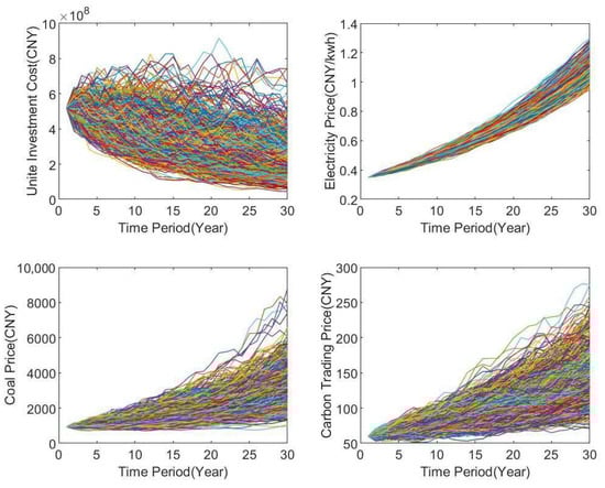 Figure 3 demonstrates the modeling of the four uncertainties of unit investment cost, electricity price, carbon trading price, and coal price through Equations (1)–(4), which reflects the 1000 paths of change in the four uncertainties under the parameters of volatility and drift rate that have been set.