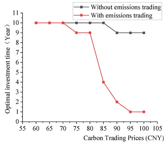 Optimal investment time under different carbon trading initial prices with/without pollution right trading.