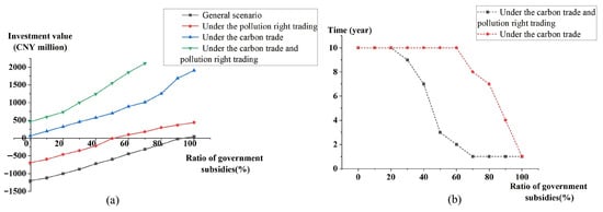 Analysis results, as depicted in Figure 5, reveal a critical insight. Without carbon trading and pollution right trading, the government’s one-time cost subsidy fails to encourage decision-makers to invest early in the investment period. This reluctance is due to the high operational costs associated with CCUS. Only when the government fully subsidizes the project’s cost can the project earn a meager profit during the operation period. In the case of carbon trading, when the government subsidy ratio reaches 70%, the optimal investment return of the project reaches 1010 million CNY, and it is recommended to invest in the 8th year, while when the government subsidy ratio gradually increases to 100%, it is recommended that the investor invests immediately.