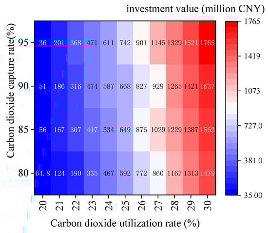 Figure 6 shows the impact of varying carbon capture and utilization ratios on the optimal investment value. When the carbon utilization rate is 20%, increasing the capture rate results in higher capture and operating costs. The growth rate of revenue from carbon utilization is slower than the cost increase, leading to a decline in the project’s optimal value. However, as the utilization rate increases, the optimal investment value of the project gradually rises, particularly at high capture rates, where the increase in optimal investment value is more significant.