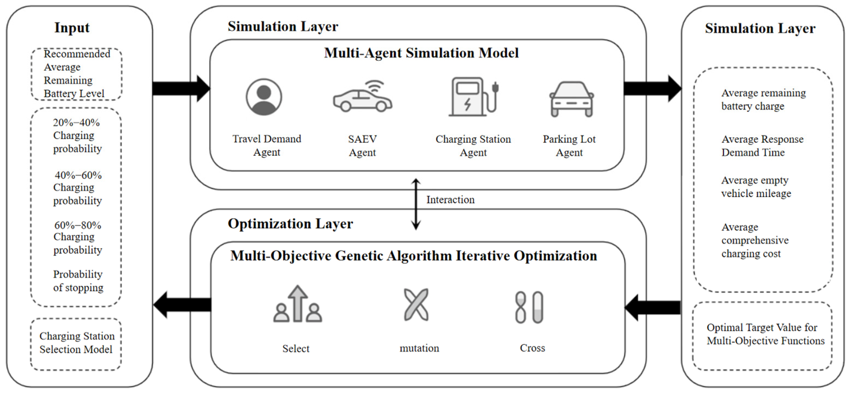 Charging Decision Optimization Strategy for Shared Autonomous Electric Vehicles Considering Multi-Objective Conflicts: An Integrated Solution Process Combining Multi-Agent Simulation Model and Genetic Algorithm | Integrated Simulation-Optimization | Trade-offs under multiple conflicting objectives (e.g., charging cost, remaining battery capacity, demand response time, empty-running mileage) | This study proposes an integrated solution process combining multi-agent simulation models and genetic algorithms to approximate global optimal solutions across 35 scenarios. It specifically addresses trade-offs between different objectives—such as passenger demand and operator requirements—and provides optimal charging decision strategies for diverse scenarios. |