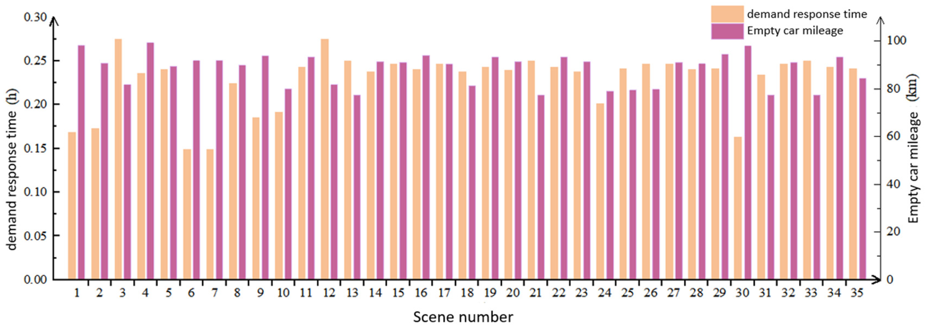 - Emergency Response Strategy (Scenario 10, weights: 0, 0.75, 0.25, 0): Ensures a low demand response time of 0.191 h (third lowest across all scenarios) while maintaining relatively optimal empty vehicle mileage of 79.944 km. Suitable for peak travel demand periods.