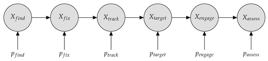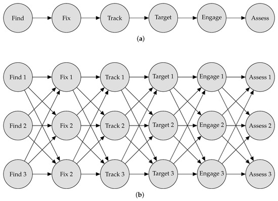 Military kill chains are the sequence of events, tasks, or functions that must occur to successfully accomplish a mission. The traditional example of a kill chain is the successful employment of a weapon against a target, but kill chains can be used for any mission where the outcomes is based on a sequence of events, for example, a cyber attack to exfiltrate information from an information system or the successful collection of information from a aerial reconnaissance mission. The term kill chain implies that this is a linear sequence of events that must be accomplished. However, the United States Department of Defense (DoD) is moving toward Combined Joint All-Domain Command and Control (CJADC2), which will require the coordination of multiple networked assets with the ability to share data and information [1]. This complex system of systems will require the evolution of the kill chain to a kill web with multiple paths to completing the mission [2]. Figure 1 displays an example of a common kill chain, the Find–Fix–Track–Target–Engage–Assess model (F2T2EA) [3,4], and a kill web with multiple paths. Further complicating matters is the addition of artificial intelligence into the kill web, which may have the ability to make autonomous decisions using probabilistic models [5]. Mathematical models for the kill web will be required to perform analysis and optimize decision-making. However, mathematical models for the kill chain need to be developed before moving to the more complex kill web.