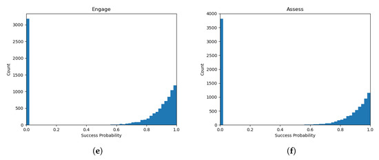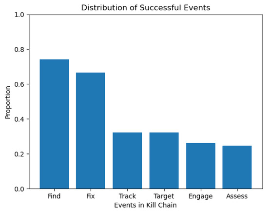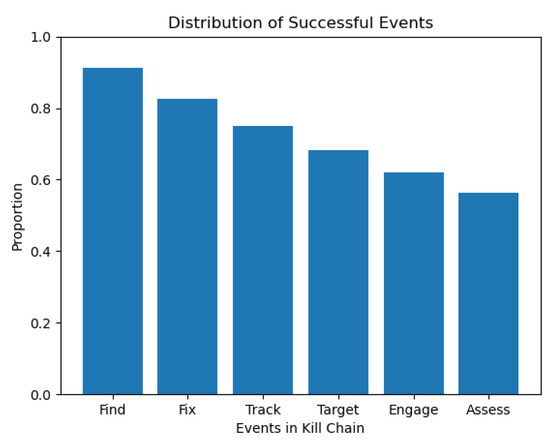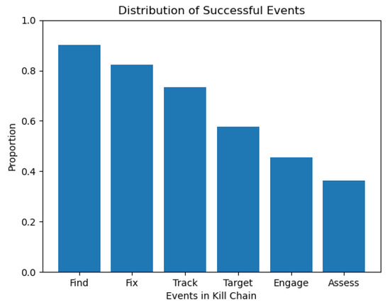 A Monte Carlo simulation is performed with . The proportion of successful kill chains is 0.247, and the variance is 0.186. Figure 15 displays the distribution of successful events.