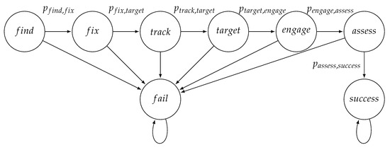The Markov model is displayed in Figure 5. The Markov model formulation for the kill chain allows the success probability (and failure probability) to be estimated by finding the steady-state distribution .