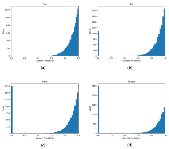 For demonstration of the quantities derived in Section 2.1, assume that the success probabilities are and . Then, using Equation (8), the success of the kill chain is estimated to be 0.373. This is validated through a Monte Carlo simulation with 1000 replications. The distribution of each event being successful is displayed in Figure 10. Using the estimated probability of success, the variance of can be calculated, where