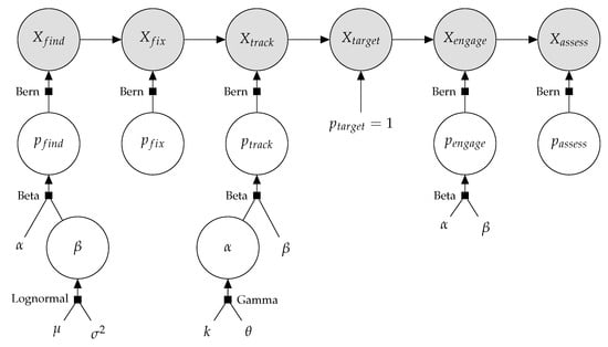 Figure 14 displays a graphical model for the hierarchical Bayesian formulation of the F2T2EA kill chain. Each event is modeled as follows:
