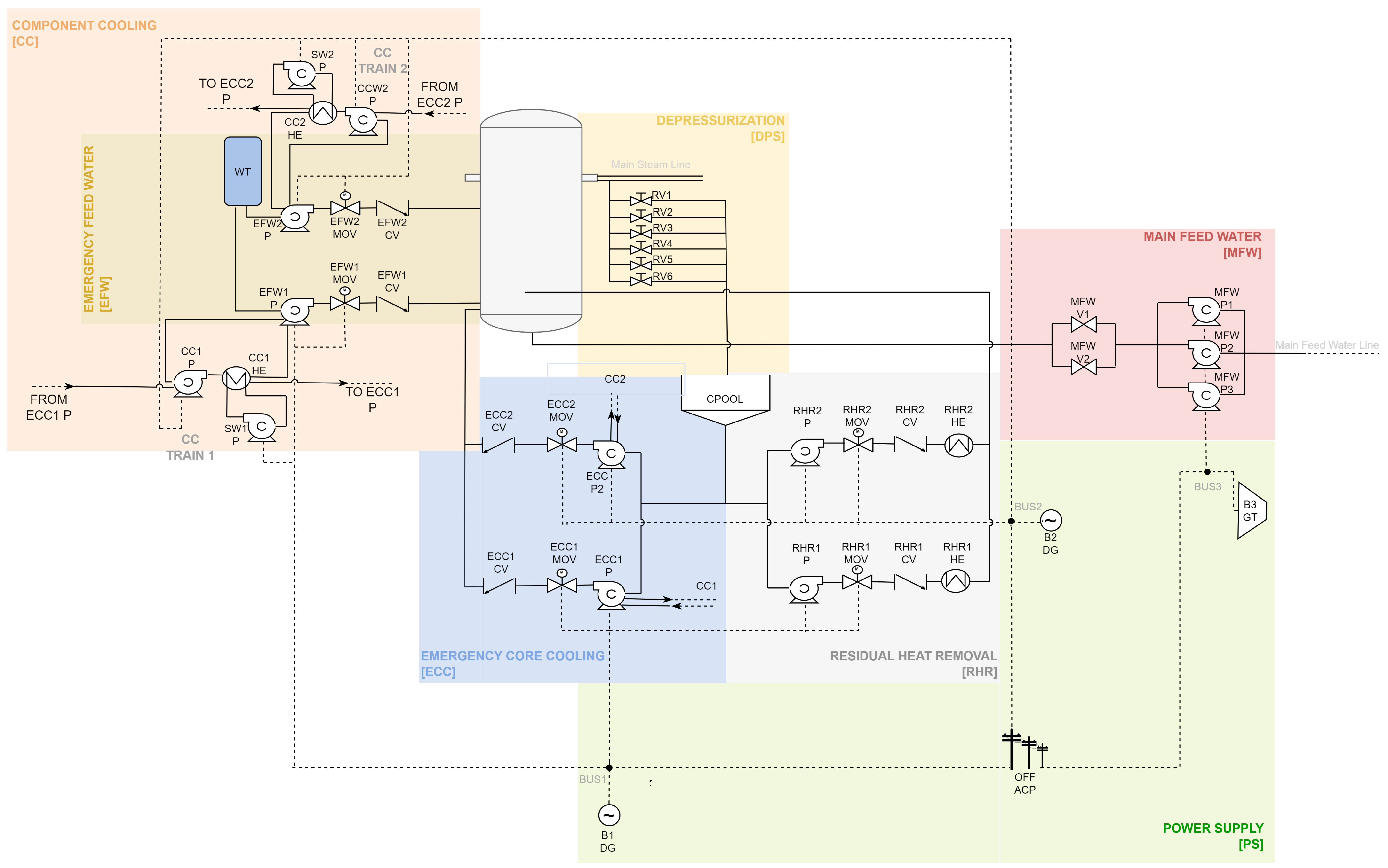 Figure 1. Five of these are functional systems that directly support reactor heat removal: main feed water (MFW), Emergency Feed Water (EFW), depressurisation (DPS), Emergency Core Cooling (ECC), and Residual Heat Removal (RHR). The remaining two are support systems, namely power supply (PS) and component cooling (CC), which do not modify the process directly but enable the operation of the functional subsystems.