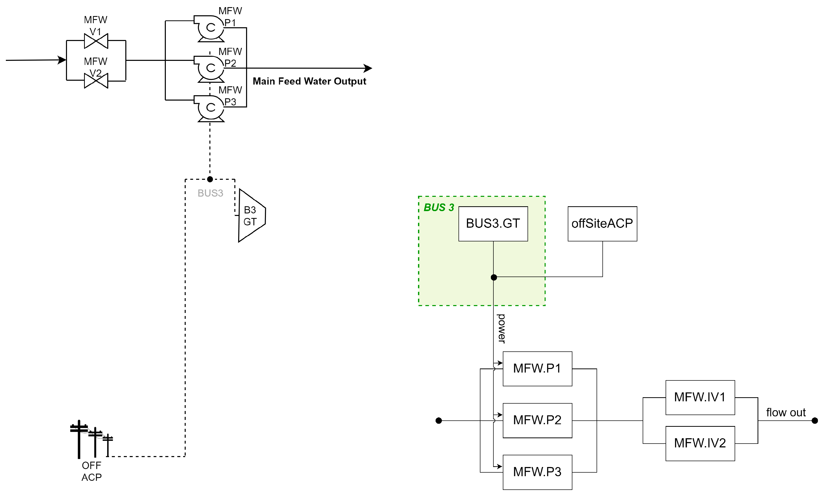 Figure 3 supplies coolant to the reactor vessel during normal operation. It consists of three pumps (MFW.P1, MFW.P2, and MFW.P3), of which any two must be operational, discharging through two redundant isolation valves (MFWI.V1 and MFW.V2). All pumps are powered by PS bus B3.