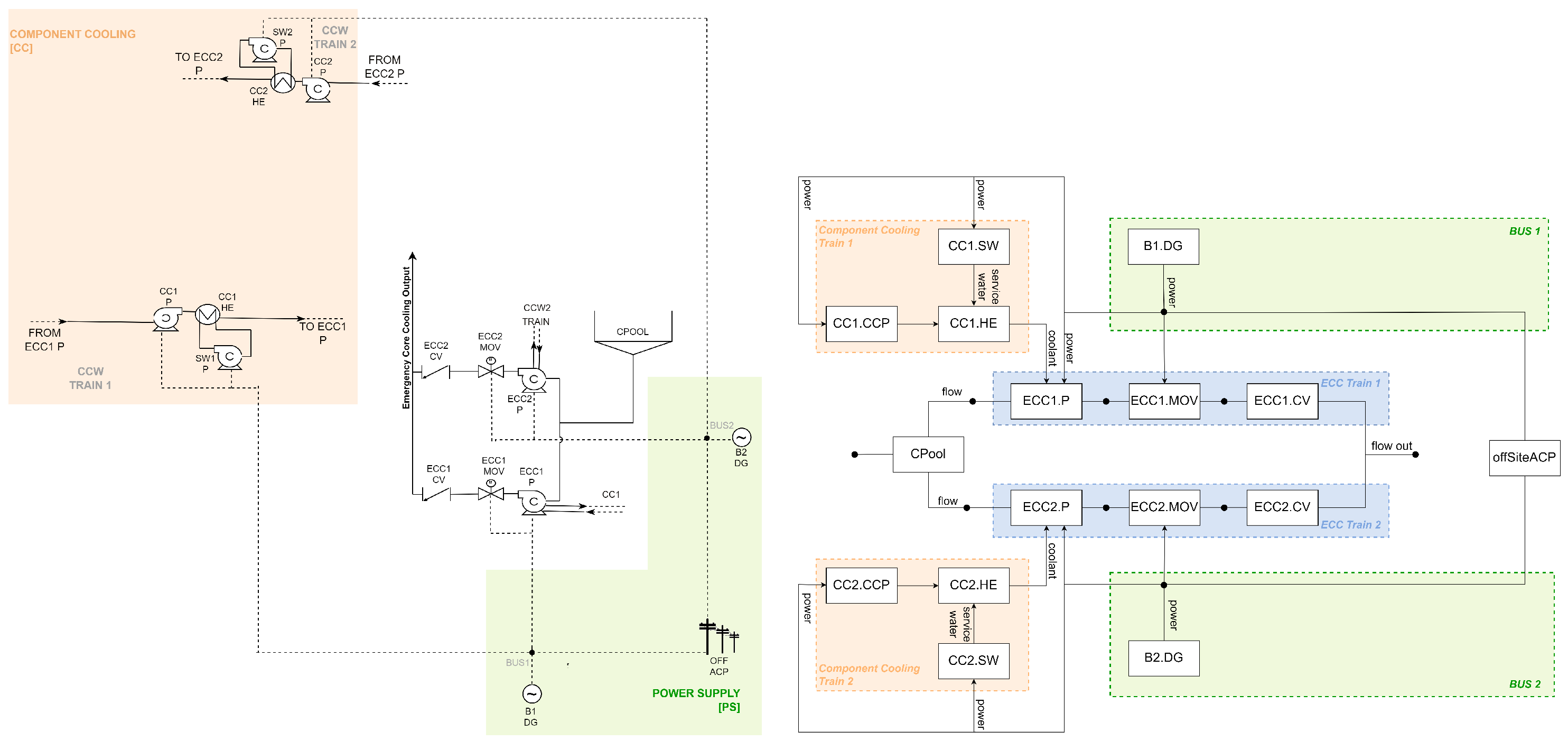 Figure 6) injects low-pressure coolant from the suppression pool CPool through two trains (ECC1 and ECC2), each equipped with a pump (ECC1.P for train 1 and ECC2.P for train 2), motorised valve (ECC1.MOV and ECC2.MOV), and check valve (ECC1.CV and ECC2.CV). Trains ECC1 and ECC2 rely on PS buses B1/B2 and CC trains CC1/CC2, respectively.
