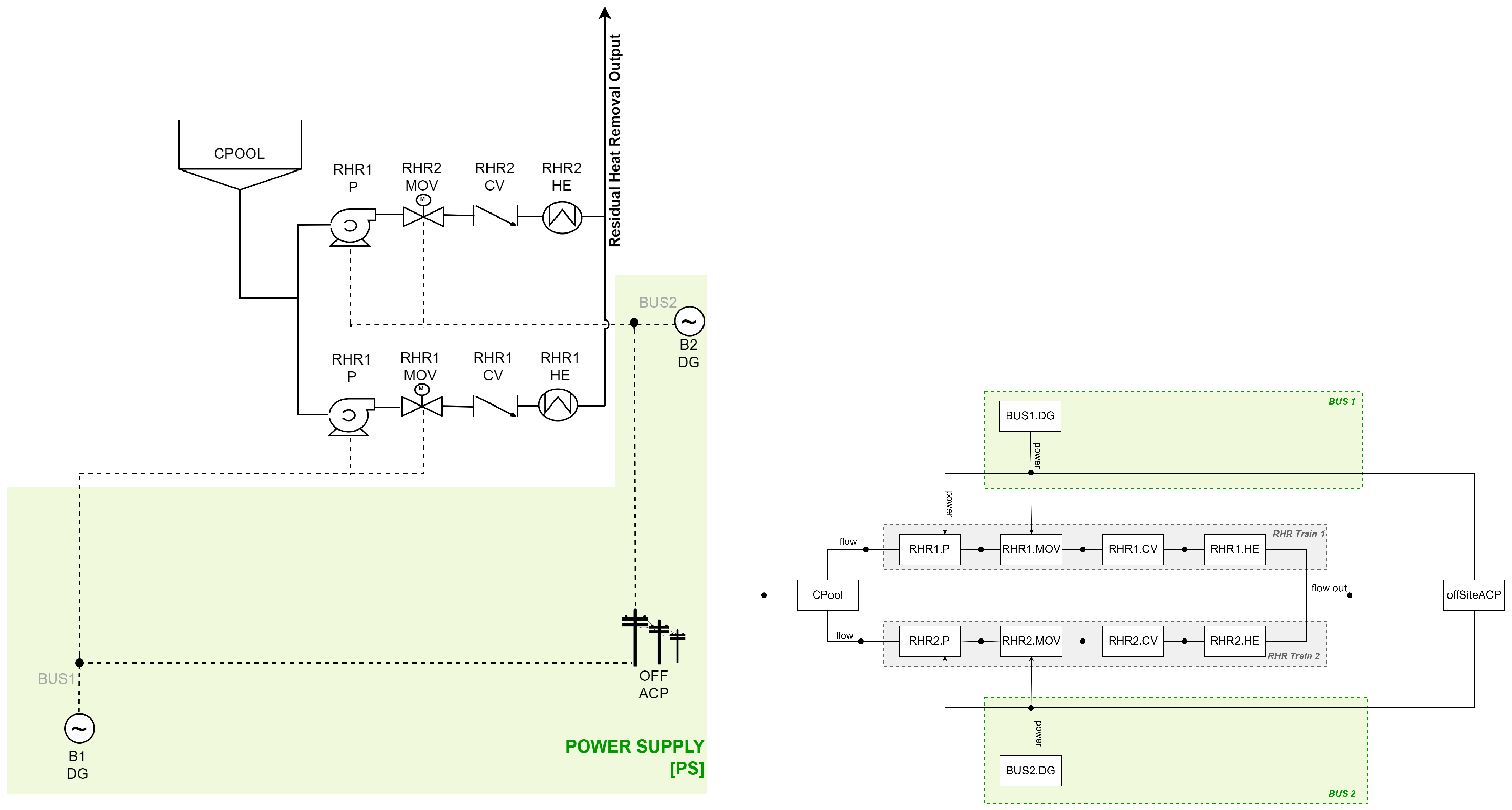 The RHR system removes decay heat during accident recovery. Its two trains RHR1 and RHR2 include a pump (RHR1.P and RHR2.P), motorised valve (RHR1.MOV and RHR2.MOV), check valve (RHR1.CV and RHR2.CV), and heat exchanger (RHR1.HE and RHR2.HE) each. RHR1 is powered by bus B1, RHR2 by B2 (