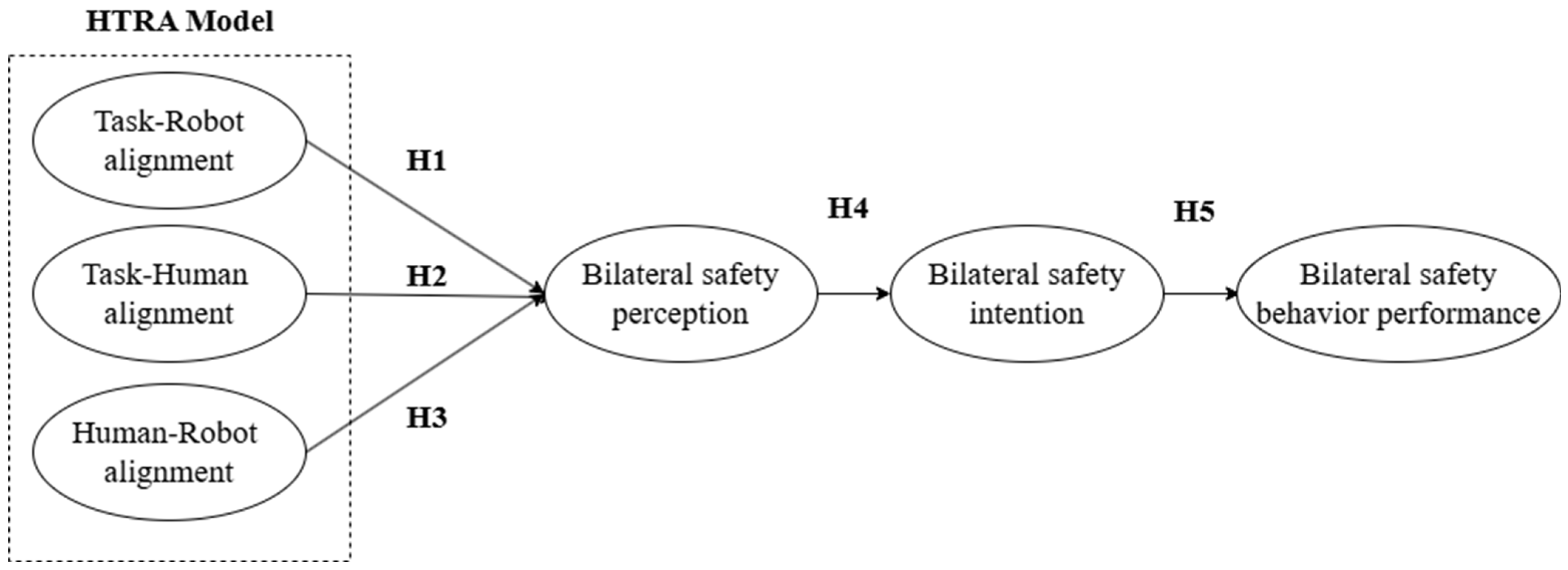 This study proposes a Human–Task–Robot Alignment (HTRA) model and a Bilateral Safety Mental Process (BSMP) model. The former comprises three pairwise alignments (i.e., Task–Robot Alignment, Task–Human Alignment, and Human–Robot Alignment), while the latter encompasses bilateral safety perception, bilateral safety intention, and bilateral safety behavior performance. This integrated theoretical framework is designed to investigate: (1) the impact of HTRA on safety behavior performance; and (2) the underlying mechanisms shaping the mental process of safety behavior performance. Based on these research objectives, the study systematically develops a set of hypotheses, as illustrated in Figure 1.