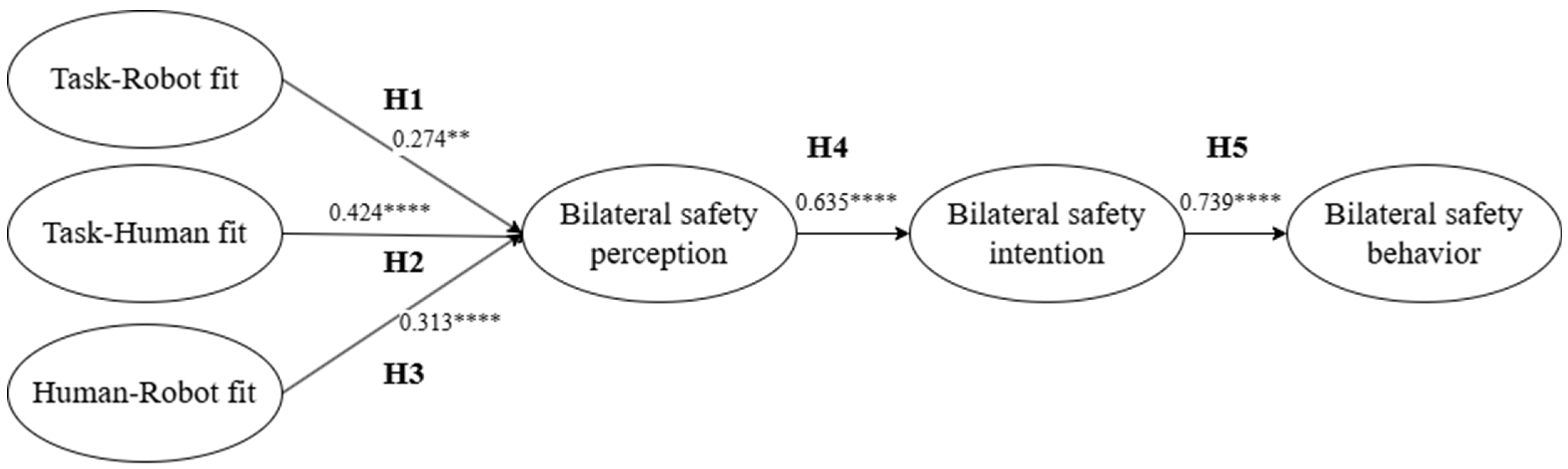 Research on the antecedents of safety behavior has extensively validated and established the psychological process from perception to intention to behavior [46,75]. However, existing construction safety studies predominantly focus on human safety, often overlooking the safety risks associated with robots, despite their evolving role from traditional mechanical equipment to collaborative counterparts in construction settings. Robots, characterized by heightened autonomy, intelligence, high cost and high precision, play a critical role in the HRC team. Therefore, this study introduces the concept of bilateral safety, expanding the traditional safety framework from unilateral protection (solely addressing human safety) to bilateral protection (ensuring the safety of both human workers and robotic counterparts). This perspective is operationalized through three key constructs: bilateral safety perception, bilateral safety intention, and bilateral safety behavior.