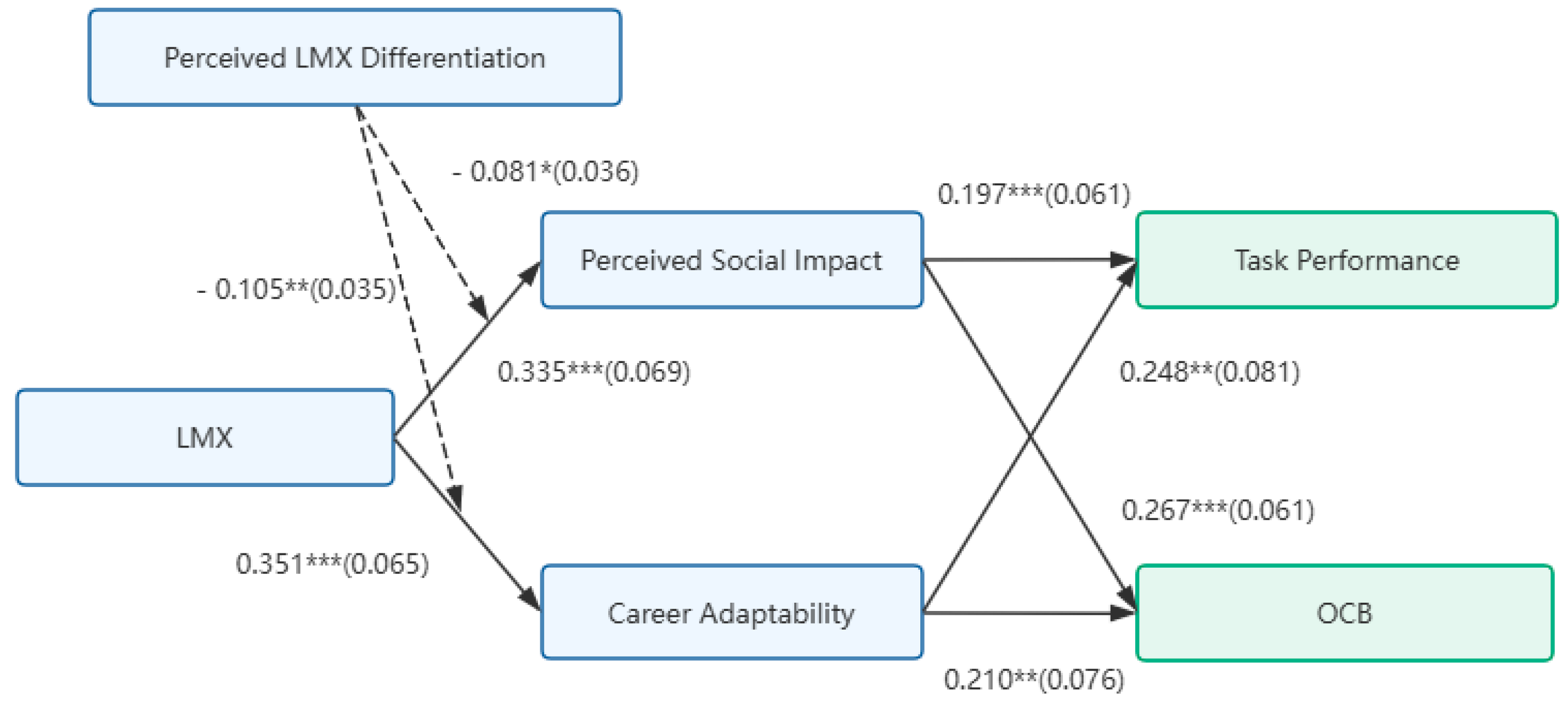 The analysis results are presented in Figure 1 and Table 3, Table 4, Table 5 and Table 6. Several relationships are statistically significant. LMX has a significant positive effect on perceived social impact (β = 0.335, p < 0.001) and career adaptability (β = 0.351, p < 0.001). In addition, social impact is positively associated with task performance (β = 0.197, p < 0.001) and OCB (β = 0.267, p < 0.001). Career adaptability is also positively associated with task performance (β = 0.248, p < 0.01) and OCB (β = 0.210, p < 0.01).
