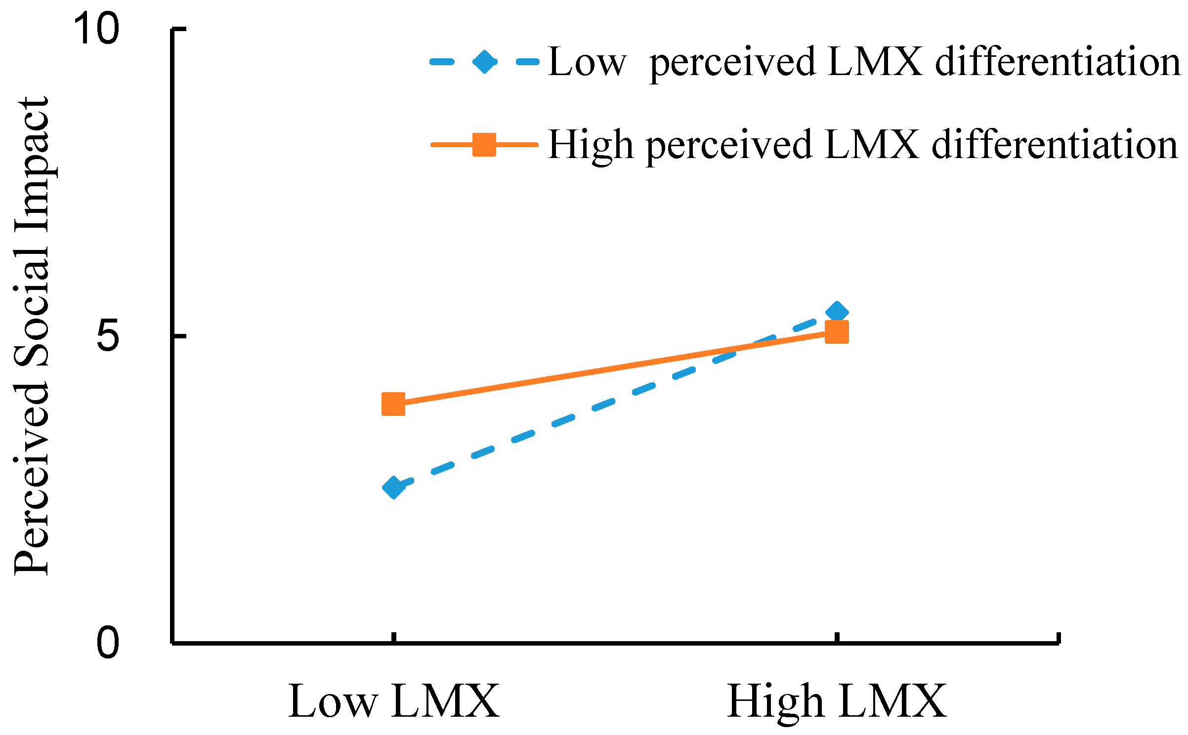 The relationship between LMX and perceived social impact depends critically on the level of PLMXD. When PLMXD is low, the relational environment is relatively egalitarian and fair. Civil servants can interpret their high-quality LMX relationships as authentic signals that their work is valued and contributes to others [22]. The fairness climate strengthens the support climate, enabling civil servants to perceive that their work benefits the public and their colleagues [55]. Social information processing theory [15] posits that when differentiation is low, the dominant social cue is one of equity and shared support, which strengthens the individual’s ability to recognize the social value of their contributions. In contrast, when PLMXD is high, the strong situation theory [56,57] explains why LMX becomes ineffective. Strong situations are characterized by clear, salient cues that lead individuals to interpret the environment, thus constraining behavioral variance. High PLMXD creates a strong negative situation: the pronounced inequality in leader treatment signals favoritism, fostering a collective belief that the leader’s behavior is normatively illegitimate [53,58]. Even civil servants with high-quality LMX relationships recognize that such advantages stem from relational favoritism rather than the social value of their work. Such differentiation erodes the interpersonal justice climate within teams [59], undermining recognition of their work’s social impact. This powerful fairness violation cue overrides individual relational advantages, leading to uniformly low or non-significant effects of LMX on perceived social impact [57]. Thus, the positive effect of LMX on employees’ perceived social impact is stronger when perceived LMX differentiation is low than when it is high.