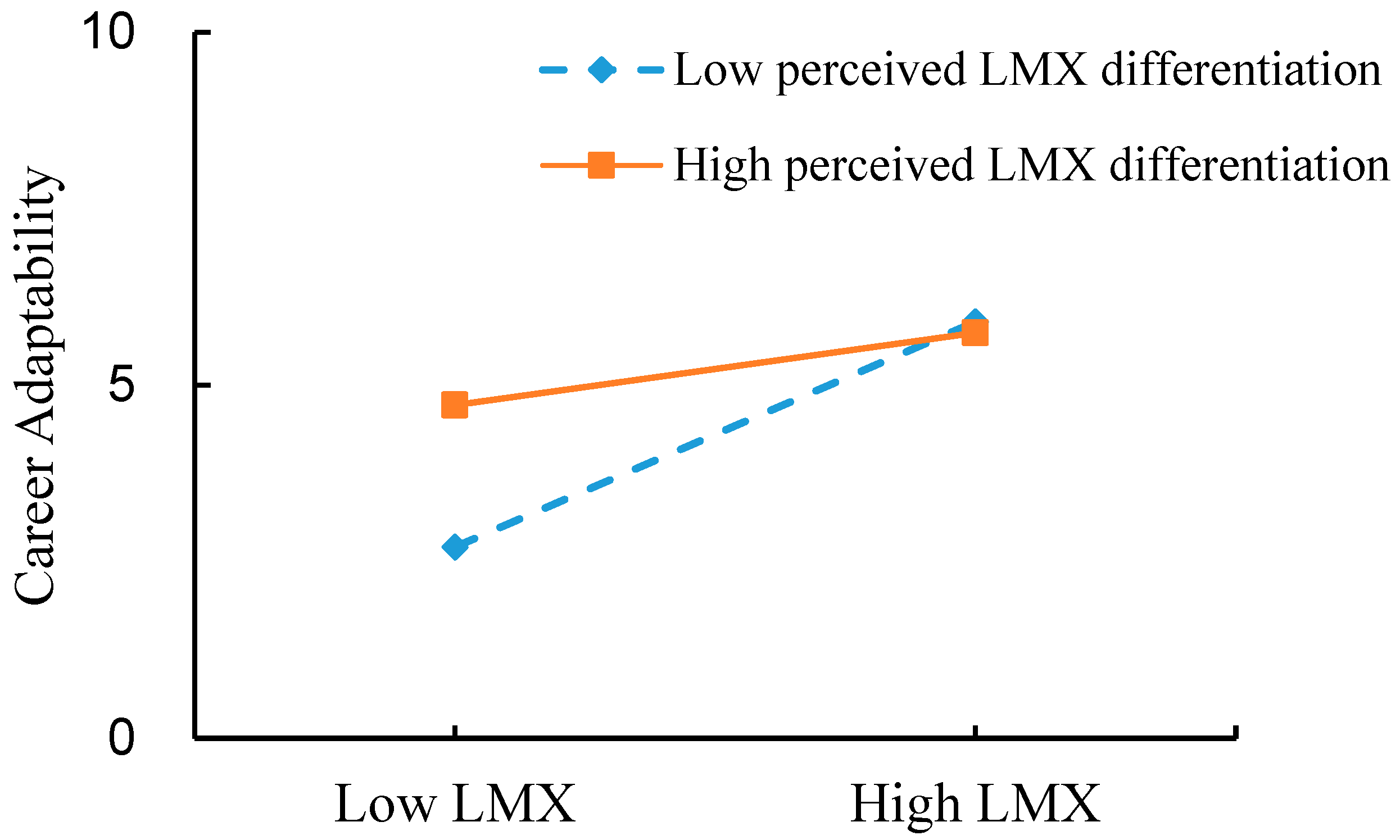 Similarly, the conversion of LMX into career adaptability depends on the perceived fairness of the relational environment. Career construction theory [16,33] posits that individuals construct vocational meaning through interpretive and interpersonal processes, particularly by observing how leaders treat others [4]. In public-sector settings, where performance criteria are ambiguous and promotion pathways rigid, civil servants are highly attuned to cues about fairness. When PLMXD is low, civil servants can interpret their high-quality LMX relationships as legitimate developmental resources that reflect recognition of their competence and potential. This enhances their career concern, career curiosity, career confidence, and career control—the four dimensions of career adaptability [33]. The fair and consistent treatment across the team reinforces the belief that effort and merit will be rewarded, encouraging proactive career management. Conversely, when PLMXD is high, the strong situation theory [57] explains why LMX becomes ineffective. High differentiation signals that resource allocation is based on favoritism rather than merit, creating uncertainty about the effort–reward correlation. These fairness violations act as a powerful negative cue, creating a shared sense that relationships matter more than merit, thereby constraining the LMX-career adaptability pathway and fostering negative work attitudes [5,54]. Such pervasive unfairness disrupts career identity construction, even among those with high-quality LMX [13]. The strong situational constraint suppresses the translation of relational resources into adaptive career strategies, effectively nullifying the developmental benefits of LMX. Thus, the positive effect of LMX on an employee’s career adaptability is stronger when perceived LMX differentiation is low than when it is high.