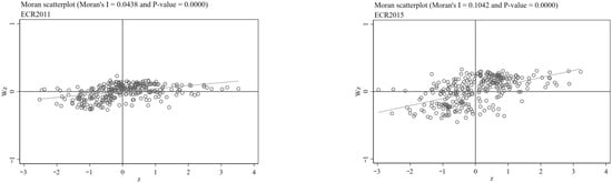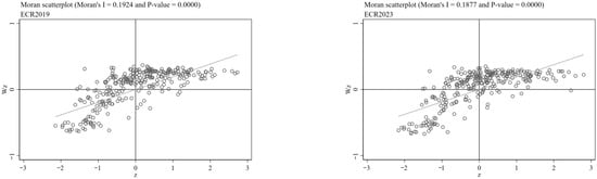 where i refers to the city; t − 1 refers to time lag item; Ei,2008 indicates the actual economic output of city i in 2008; and ECRi,t−1 indicates the economic resilience of city i in year t − 1. The larger the indicator, the higher the urban economic resilience, and the greater its ability to resist or recover from uncertain shocks.