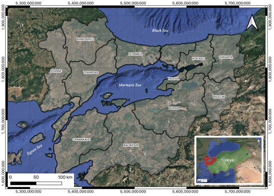 Within the scope of this study, the Marmara Region, which covers 11 provinces of Türkiye (Istanbul, Tekirdağ, Edirne, Kırklareli, Balıkesir, Çanakkale, Bursa, Bilecik, Sakarya, Kocaeli, and Yalova), is determined as the study area (Figure 1). According to data provided by the TÜİK Geographical Statistics Portal, the Marmara Region encompasses a total surface area of approximately 67,000 km2. According to the address-based population registration system data as of 31 December 2023, the region is home to more than 26 million people, representing a substantial proportion of Türkiye’s total population. The Marmara Region comprises several provinces of major socioeconomic, cultural, and touristic significance, including the megacity of Istanbul and the industrial hubs of Bursa and Kocaeli provinces. Therefore, it can be inferred that any flood disaster occurring within the Marmara Region would have the potential to cause severe human casualties and extensive economic and material losses.