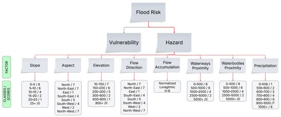 Flood hazard factors (red arrows) and class scores.