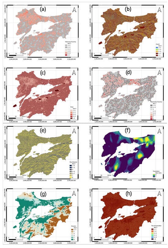 Flood hazard factor maps: (a) waterways proximity, (b) aspect, (c) slope, (d) waterbodies proximity, (e) flow direction, (f) precipitation, (g) elevation, and (h) flow accumulation.