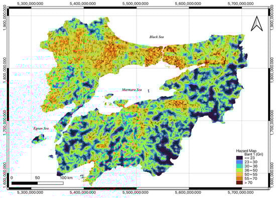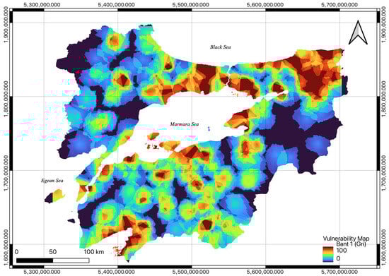 When assessing risk, hazard, and vulnerability, the criteria should be evaluated together. This approach, which is frequently used in risk assessment, has been expressed by many researchers as “Risk = Hazard × Vulnerability” [,,,]. In this context, the hazard and vulnerability maps are produced by using the rasterio library at the same pixel resolution and multiplying both raster data to obtain the Marmara Region flood risk map. In this process, first, an environment is prepared for reading and writing raster data with the osgeo.gdal library and osgeo.osr function, which is the Python binding of GDAL. The pixel values of the generated raster data (flood hazard map and flood vulnerability map) are accessed with the “osgeo.gdal” and “numpy” libraries. Afterwards, risk scores are generated by multiplying each pixel by each other (preserving no-data values) using the numpy library. The final risk map created using the “osgeo.gdal” library is saved as a raster (Figure 11).