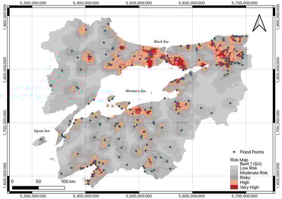 In the context of disaster preparedness, automatic water level meters and SMS/application-based alarm systems can be installed in regions with very high and high risk. Drainage investments, such as rainwater lines, rain gardens, and infiltration pits, should be prioritized in high-risk urban areas. Areas that the model identifies as medium risk but contain past flood points (false negatives, FN) can be verified through field inspections. New parameters can be added to the model, and the number of criteria used in the model can be increased. Zoning plans and emergency response plans should be updated in accordance with this map layer; construction restrictions may be considered, especially in “very high” zones. In this study, various machine learning algorithms were employed to assess flood risk in the Marmara Region, and their accuracies were compared. Hazard was weighted with the AHP, an MCDM method, and a hybrid approach was adopted. The accuracy of the developed model is significantly increased when applying different methods and the proposed hybrid approach.