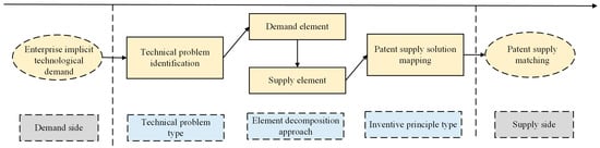 Essentially, the supply–demand matching process is also a problem-solving process. From this perspective, an enterprise’s technology demand represents a statement of a technical problem, while patents provide corresponding technical solutions. This process aligns with the Theory of Inventive Problem Solving (TRIZ), which holds that specific technical problems can be abstracted into standardized inventive problems. By applying general inventive principles, feasible solutions can be identified and then refined into targeted innovative schemes, thus achieving a systematic transformation from problem identification to solution generation [].