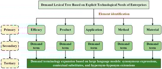 For explicit technology demands, enterprises can provide detailed descriptions of the five content elements: material, method, efficacy, product, and application. The terms corresponding to each element carry clear technical meanings and effectively reflect the enterprise’s focal concerns and expected objectives regarding the required technology. Therefore, this study adopts a direct extraction method to identify representative technical terms within the five element categories and constructs a complete demand expression framework.
