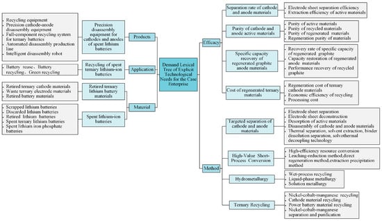 Existing studies have not clearly defined or classified the elements of enterprise technological demands. Current academic research mainly relies on patents and scientific papers as analytical texts, extracting technical elements from them and constructing general classification systems that include dimensions such as products, methods, materials, components or parts, efficacy or performance, technical attributes, application fields, and influencing factors []. The technological element systems derived from such scientific and technical literature are characterized by academic rigor and specialization, focusing primarily on explaining the principles of technological innovation and implementation mechanisms.