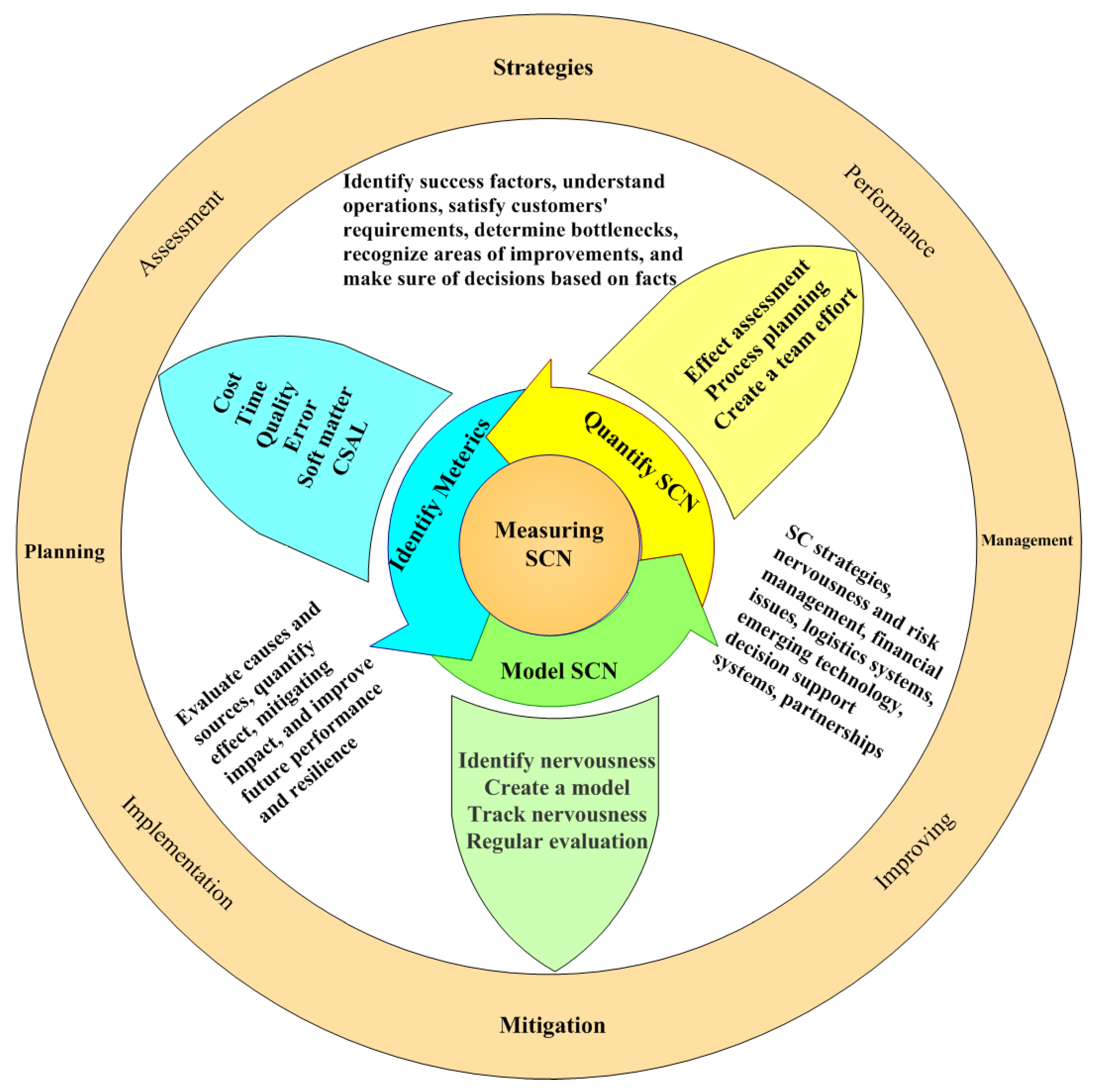 Decision-makers have been paying greater attention to SCN lately because of the emergence of new threats and worldwide crises. The proposed SCN measuring model aimed to measure SCN and incorporate it into future SC architecture. SCN measures are essential for assessing a SC’s performance and should be included in any strategy, plan, or design. Businesses may be able to enhance their nervousness management strategies and better equip themselves for impending risks by taking SCN measurements into account.