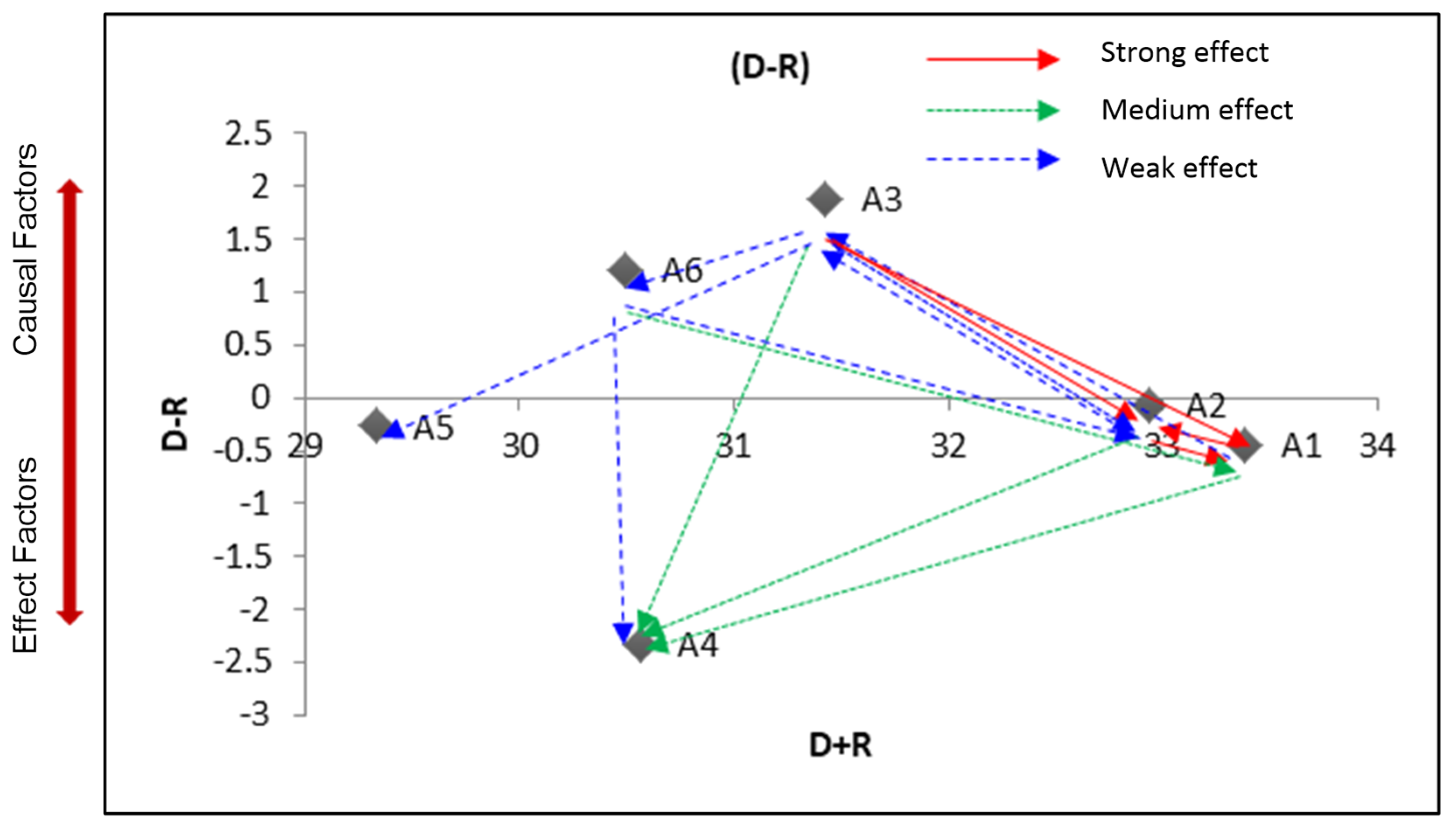 Table 15 shows that, the effect factors are A1, A2, A4, and A5, whereas A3 and A6 are the causal factors. Cost (C), time (T), error (E), and soft matters (S) are the effect elements, whereas quality (Q) and customer satisfaction level (CSAL) are the causal elements.