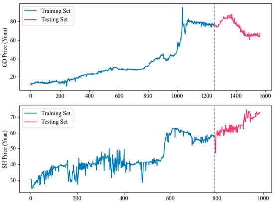 Two daily carbon price datasets from Guangdong and Shanghai carbon markets, named GD and SH, are selected as study cases to test the prediction performance of the proposed model. Each dataset spans 1 August 2017 to 31 March 2024, with the first 80% allocated as the training set and the remaining 20% as the testing set. Figure 2 shows the trend changes in the two carbon price series.