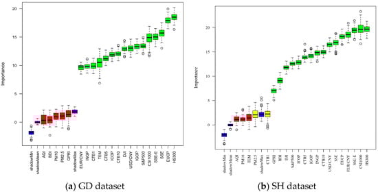 In the Boruta method, a feature is typically rejected when its importance is lower than the maximum importance of all shadow features [,]. After inputting GD and SH datasets into Boruta, five features are identified as “unimportant”. Figure 3 displays the importance of each feature in the GD and SH datasets. Finally, the prediction models are populated with sixteen important features from both datasets, in conjunction with their carbon price series. Table 2 shows the selected influencing factors of two datasets.
