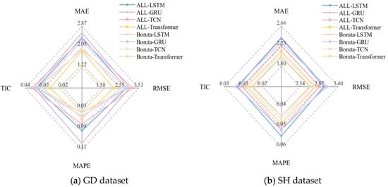 Experiment I aims to validate the impact of the Boruta feature selection algorithm on the model performance. It compares the prediction performance differences between models using all variables and those using Boruta-filtered features, further exploring the interference effects of redundant features in multi-source data. First, four common models, including LSTM, GRU, TCN, and Transformer, are selected for experiments using the GD and SH datasets. Subsequently, all-variable models and models with Boruta-selected variables are constructed to compare and analyze their predictive performance. Figure 4 and Table 4 show the prediction results of these models.