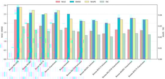- Hybrid model construction: This step first constructs common baseline models (LSTM, GRU, TCN, and Transformer) and their enhanced variants (BiLSTM, BiGRU, BiTCN, and Informer). Through Experiment II, the optimal models, i.e., Informer and Transformer, are selected via comparative analysis. Subsequently, the Informer and Transformer models are combined to build a hybrid model, namely BiTCN-Informer. Finally, Experiment III is also conducted to validate the predictive performance of the proposed hybrid model through comparative analysis.