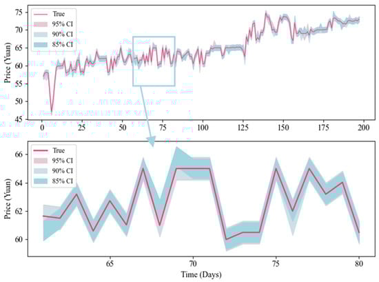 - Regarding model interpretability and practicality, this study employs the SHAP method to deeply reveal nonlinear interactions among carbon price drivers. The findings indicate that energy prices dominate carbon price fluctuations in the Shanghai carbon market, while EU carbon prices exert a significant influence on the Guangdong carbon market. Furthermore, the proposed model maintains its advantage in both the EU carbon market and the U.S. Henry Hub natural gas market. For instance, in the EU market, the proposed model achieved an MAE of 1.6336, representing an 11.0240% reduction compared to the Boruta-Informer model. In the natural gas market, the MAE improvement over the Boruta-Informer model reaches 30.7937%. Moreover, the interval prediction capability of the proposed model provides practical risk boundaries, offering robust support for enterprises and decision-makers in formulating strategic plans within uncertain market environments.
