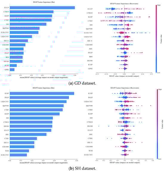 From the bar chart, in the Guangdong carbon trading market, the five most influential factors driving carbon price fluctuations are the EU-ETS carbon price, China Treasury Bond (10-year), international crude oil price, China Treasury Bond (5-year), and the Dow Jones Index. Notably, the EU-ETS carbon price exerts a significantly stronger impact than the other factors, surpassing the second-ranked feature by a SHAP value margin of 0.01. This pronounced influence is likely attributed to Guangdong’s export-oriented economic structure. As China’s largest export hub, Guangdong accommodates numerous energy-intensive manufacturing enterprises whose carbon cost accounting is directly influenced by the EU Carbon Border Adjustment Mechanism (CBAM). Consequently, the EU-ETS carbon price transmits cross-regional policy spillover effects to the Guangdong carbon market, reinforcing its susceptibility to external regulatory and market dynamics. In contrast, the Shanghai carbon trading market exhibits a different set of key drivers. The five most influential factors are the international crude oil price, international natural gas price, USD/CNY exchange rate, S&P 500 Index, and China Treasury Bond (5-year). This indicates that energy market prices and financial market indicators play a dominant role in shaping carbon price dynamics in Shanghai. A plausible explanation is Shanghai’s status as a global financial hub, where market participants are more inclined to incorporate global energy supply–demand shifts and cross-border capital flows into their carbon asset pricing strategies.