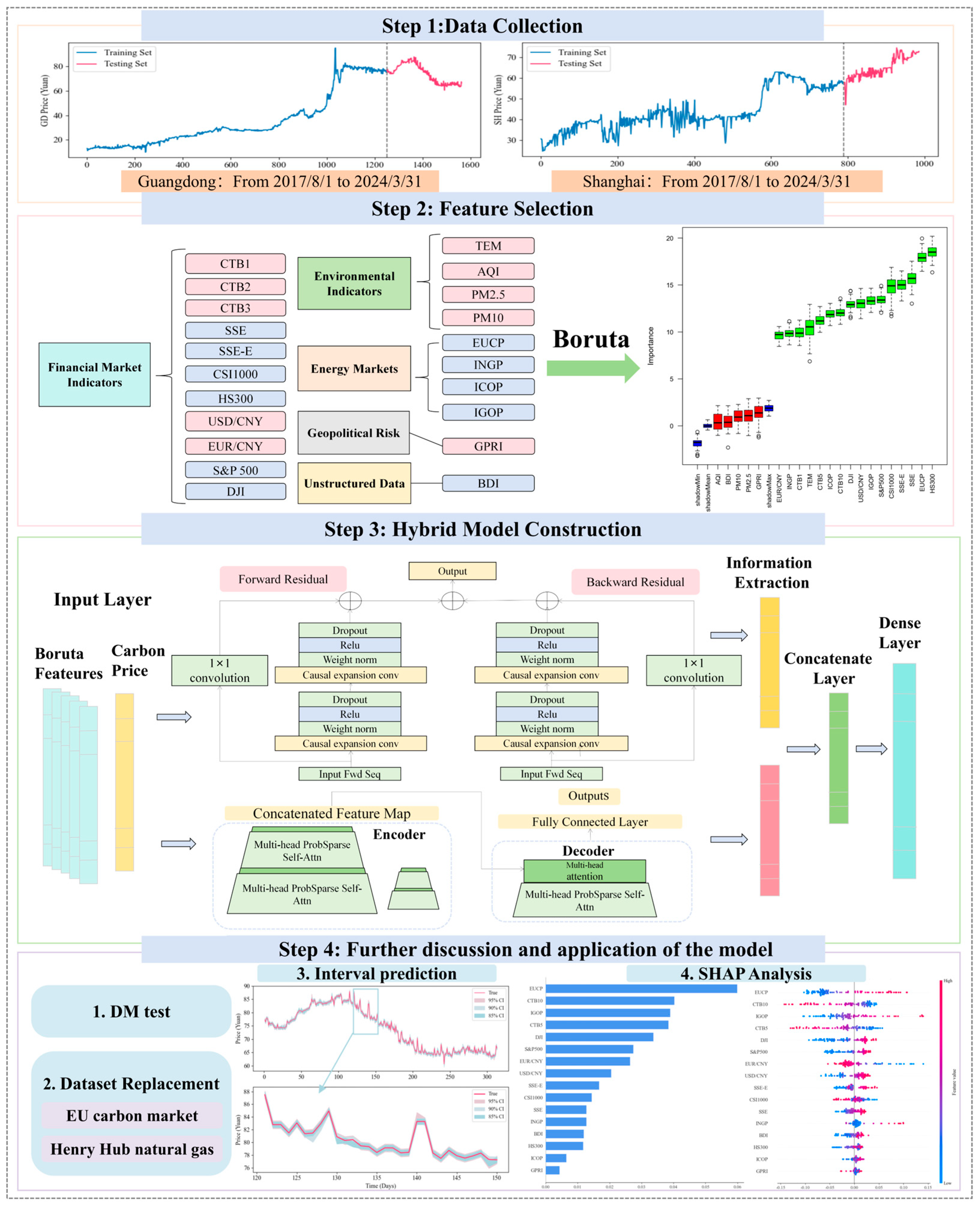 Inspired by the preceding discussion, this study combines feature screening algorithms, deep learning models, and interpretable explanatory analytics to construct an interpretable hybrid system for carbon market price prediction. First, multidimensional data sources, including macroeconomic indicators and the Baidu Index, are considered. The Boruta feature selection algorithm is then employed to construct a feature subspace, ensuring the inclusion of the most relevant predictive variables. Next, this study proposes a hybrid architecture of BiTCN and the Informer model, where BiTCN is used to extract local spatio-temporal dependent features, while the Informer captures the global features of the long sequences through the connectivity mechanism, which enables phased feature extraction and improves the prediction accuracy. Then, in order to improve the interpretability of the model and quantify the uncertainty, this study introduces the Shapley additive explanations (SHAP) to analyze the feature contributions in the prediction process and the Monte Carlo dropout method to achieve interval prediction, which provides a more interpretable prediction framework. Moreover, the contributions of this study are summarized below. (1) Previous studies have largely focused solely on structured data, neglecting unstructured information such as market sentiment. This study integrates twenty-one influential factors, including environmental variables such as weather and air quality, as well as macroeconomic indicators such as government bond yields and stock prices. Additionally, it also incorporates non-structural data, such as the Baidu Index, which can reflect real-time market sentiment and public attention, thereby enhancing the accuracy and timeliness of the predictions. (2) Traditional methods often employ linear ensembles, which struggle to uncover synergies between different models and provide only point predictions lacking interpretability analysis. This paper proposes a hybrid model that combines the strengths of multiple deep learning models. It preserves the original features without complex data decomposition, significantly improving prediction accuracy and enabling interval predictions. Simultaneously, it achieves interpretable predictive analysis using the SHAP method. (3) Previous studies lacked cross-regional, multi-scenario experimental validation. This paper conducts comparative experiments across multiple carbon markets, including Shanghai, Guangdong, and the EU. The results demonstrate the model’s significant predictive advantages and robustness across diverse market environments.
