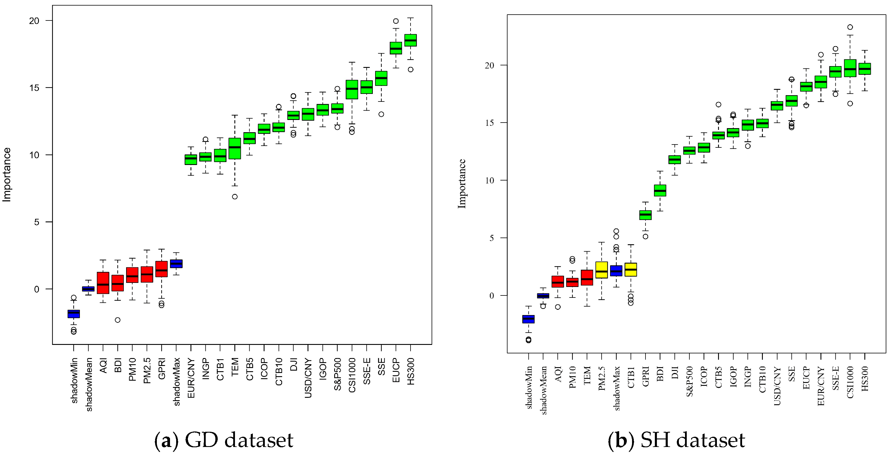 Feature selection: The Boruta method is first applied to reduce the dimensionality of 21 commonly used carbon prices and influencing factor data across five dimensions. These factors encompass both structured and unstructured data. Subsequently, Experiment I is conducted to validate the effectiveness of the Boruta method in enhancing prediction accuracy.