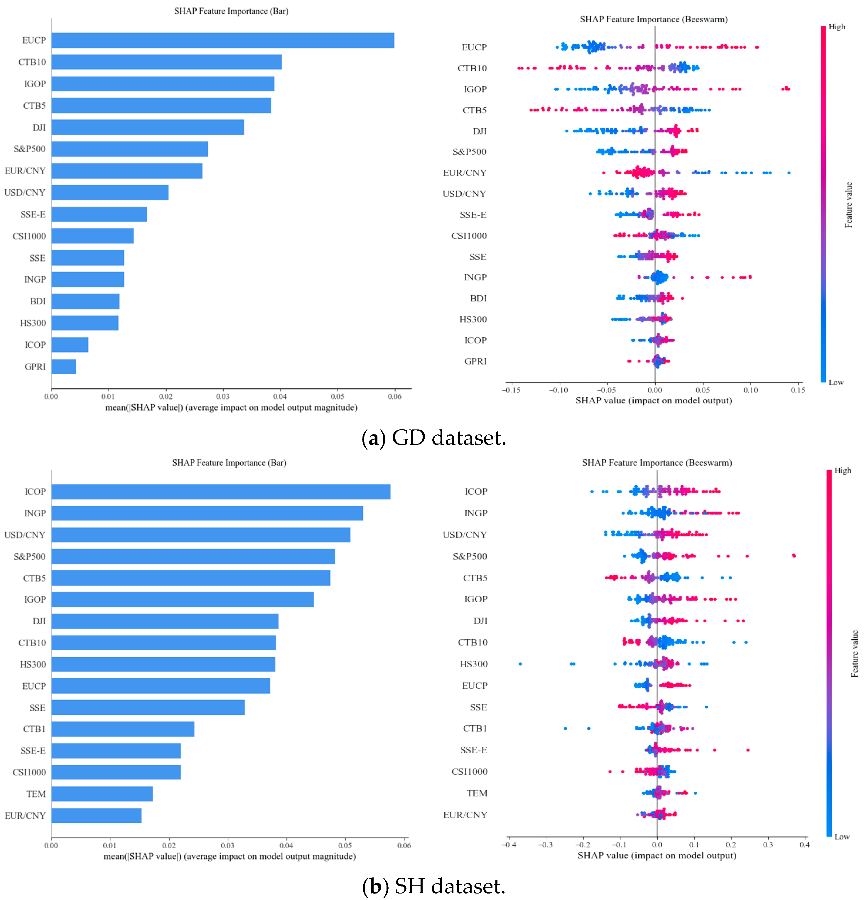 SHAP originates from the concept of Shapley values in game theory [49] and has been widely adopted to interpret machine learning model predictions [50], providing interpretability for complex black-box models. SHAP shows important value in predicting carbon price, and reveals the nonlinear influence and interaction effect of carbon price drivers through global and local explanations [51]. The Shapley value for feature i is computed as follows:
