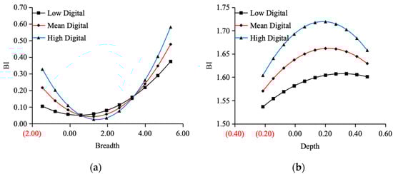 Marginal effect plots of network embeddedness on breakthrough innovation at different levels of digitalization: (a) effect of network embeddedness breadth on breakthrough innovation; (b) effect of network embeddedness depth on breakthrough innovation.
