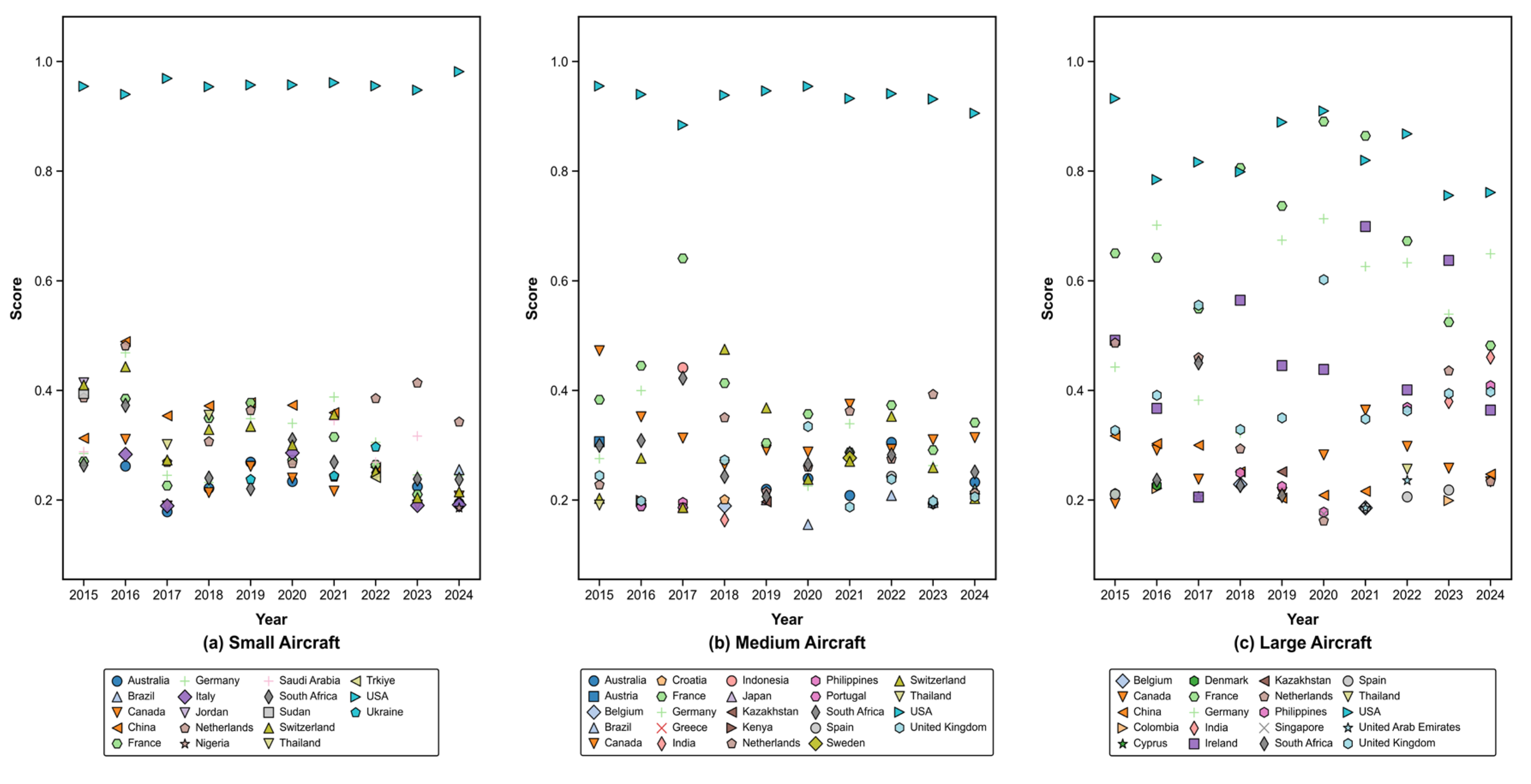 - The United States occupies a pivotal position within the GATN. Trade in small aircraft demonstrates significant volatility across countries. In contrast, medium and large aircraft are more difficult to manufacture and command higher prices, resulting in relatively stable rankings among key nodes in the global medium and large aircraft trade networks over the past decade. Within the global medium aircraft trade network, the USA, France, Canada, and South Africa consistently rank among the top five most important nodes in most years, reflecting a pattern of one dominant player alongside several strong competitors. In the global large aircraft trade network, France, Germany, and Ireland have scores close to that of the USA, indicating a state of multiple strong players coexisting.