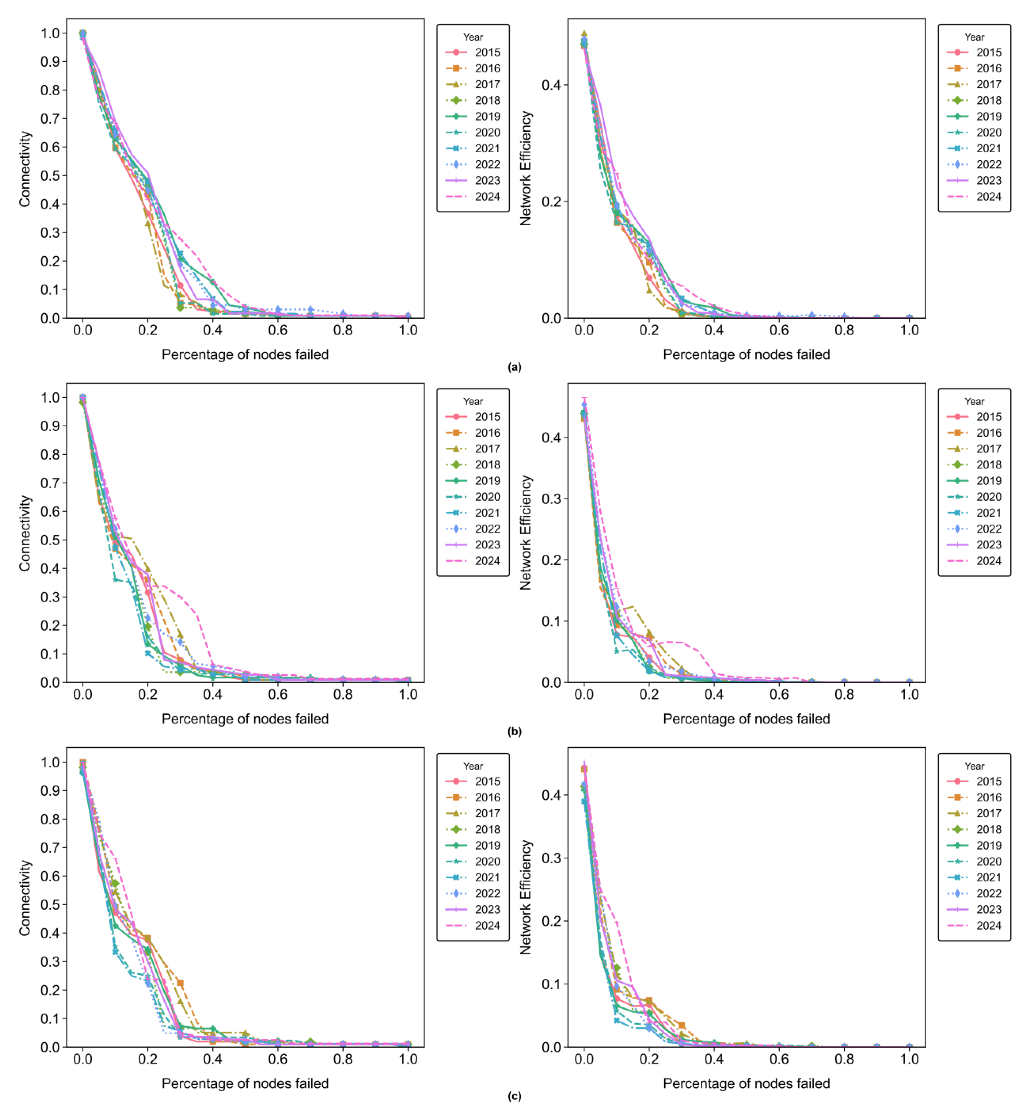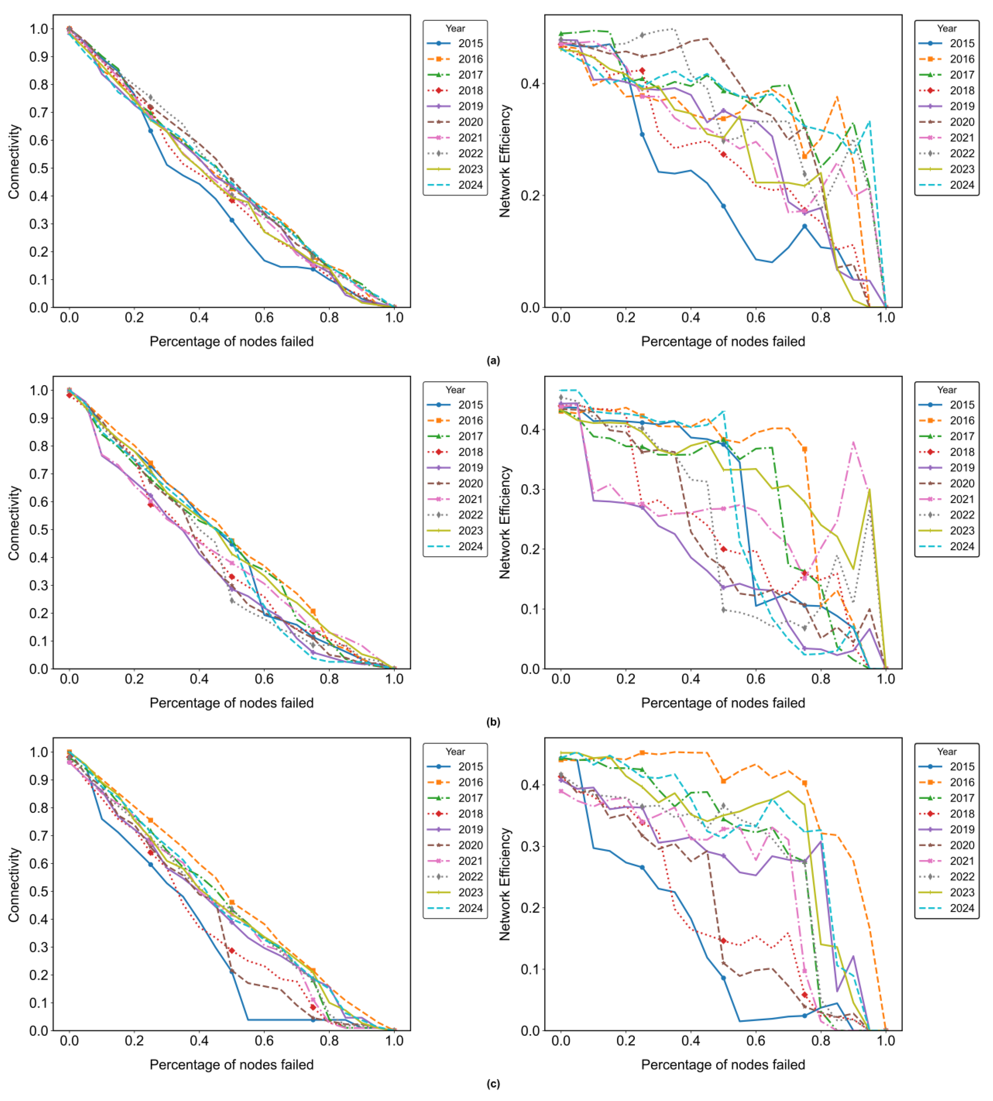 - The damage caused by RA to the GATN is significantly less than that caused by TA. When the GATN experiences TA, connectivity and efficiency decline rapidly. This indicates that a few critical countries play a pivotal role in the aircraft trade network; removing these key countries can easily lead to the paralysis of the entire network. For example, under TA, the connectivity of medium and large aircraft trade networks drops to only about 0.1 after removing 20% of nodes; whereas under RA, the connectivity remains around 0.6 after removing the same proportion of nodes. The significant disparity between the two scenarios demonstrates the critical role of key nodes in stabilizing aircraft trade networks. Under RA, the robustness gaps among global trade networks for small, medium, and large aircraft are relatively small, indicating that RA has a limited impact on the overall aircraft trade network. Compared to the medium and large aircraft trade, the small aircraft trade involves more participating countries and a more complex network. Under TA, the global small aircraft trade network demonstrates greater robustness than the medium and large aircraft networks.