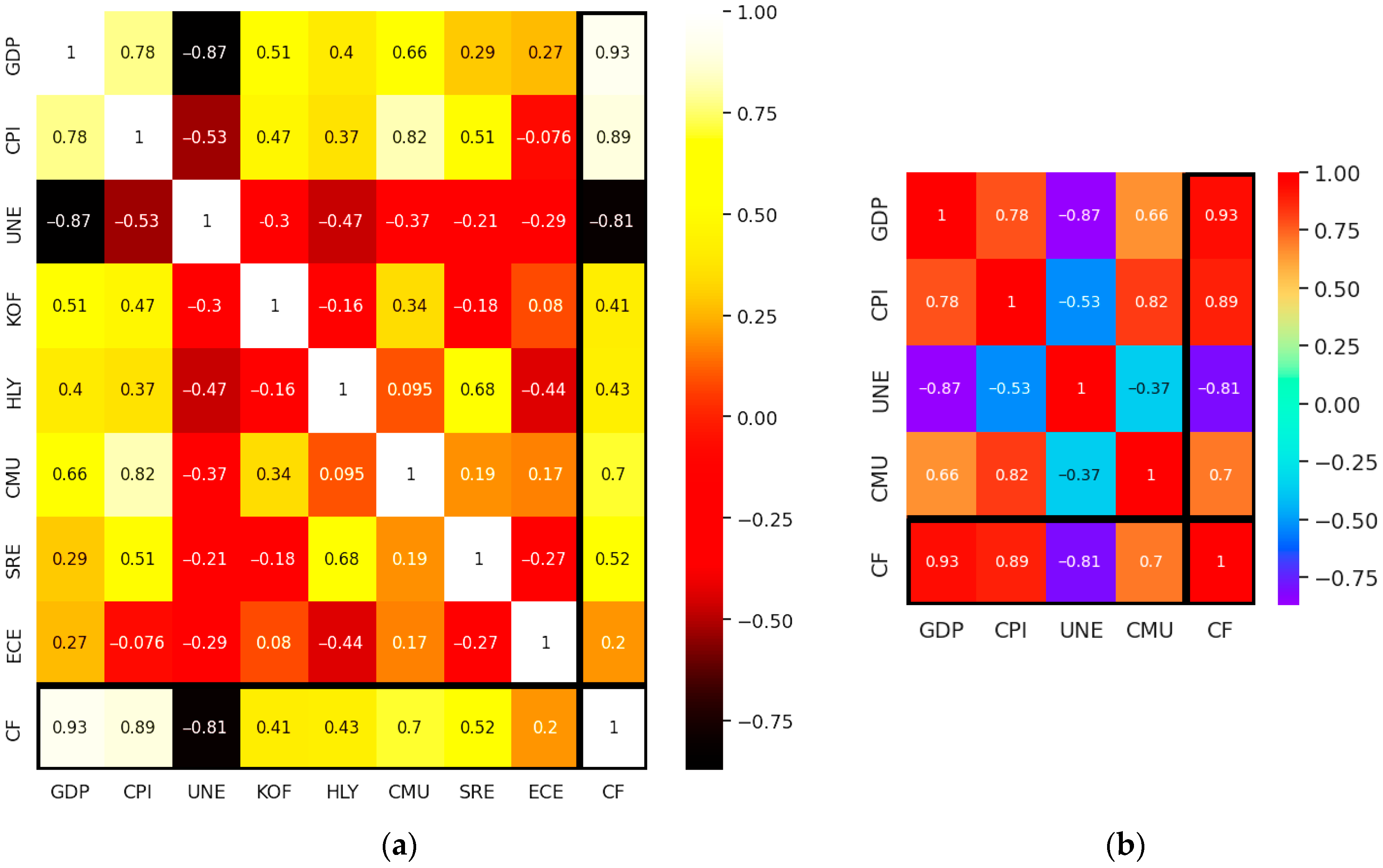 To identify the most influential indicators affecting the CF, a preliminary correlation analysis was conducted across all available socioeconomic and environmental variables, involving constructing a correspondence matrix that quantifies the strength of correlations in numerical form. The correlations are considered stronger as their values increase, as illustrated in
