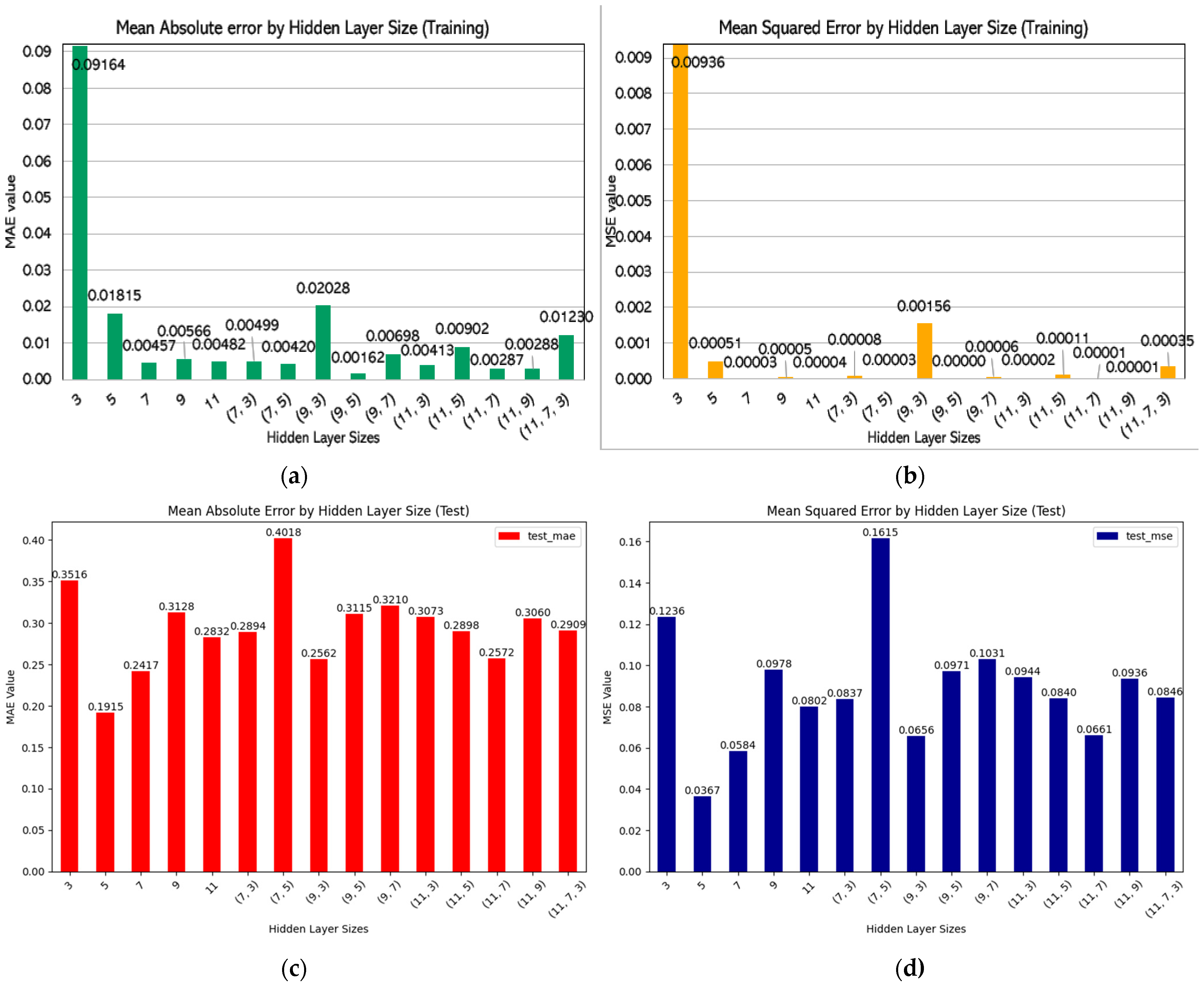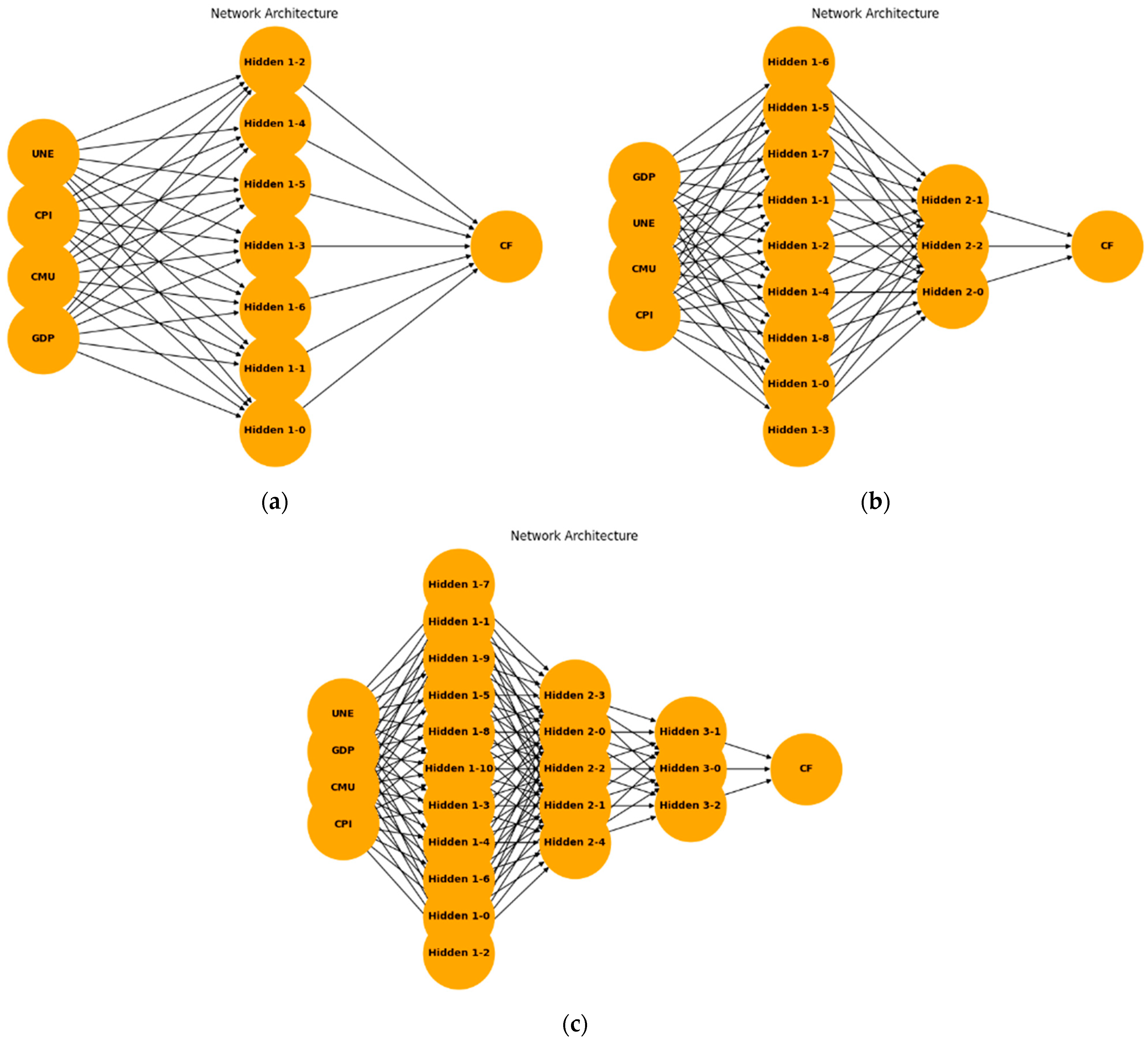 To determine the optimal internal structure of the ANN (i.e., the number of hidden layers and hidden neurons), several configurations were tested and evaluated, examples of these structures are shown in