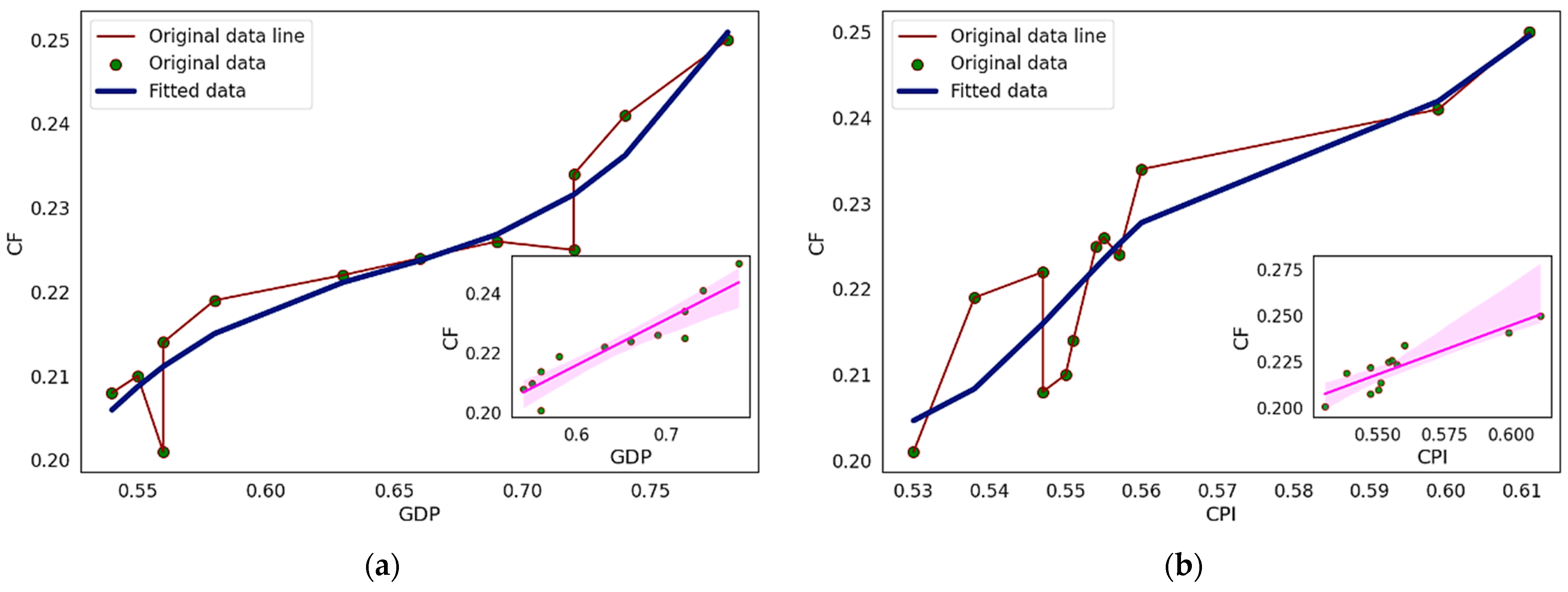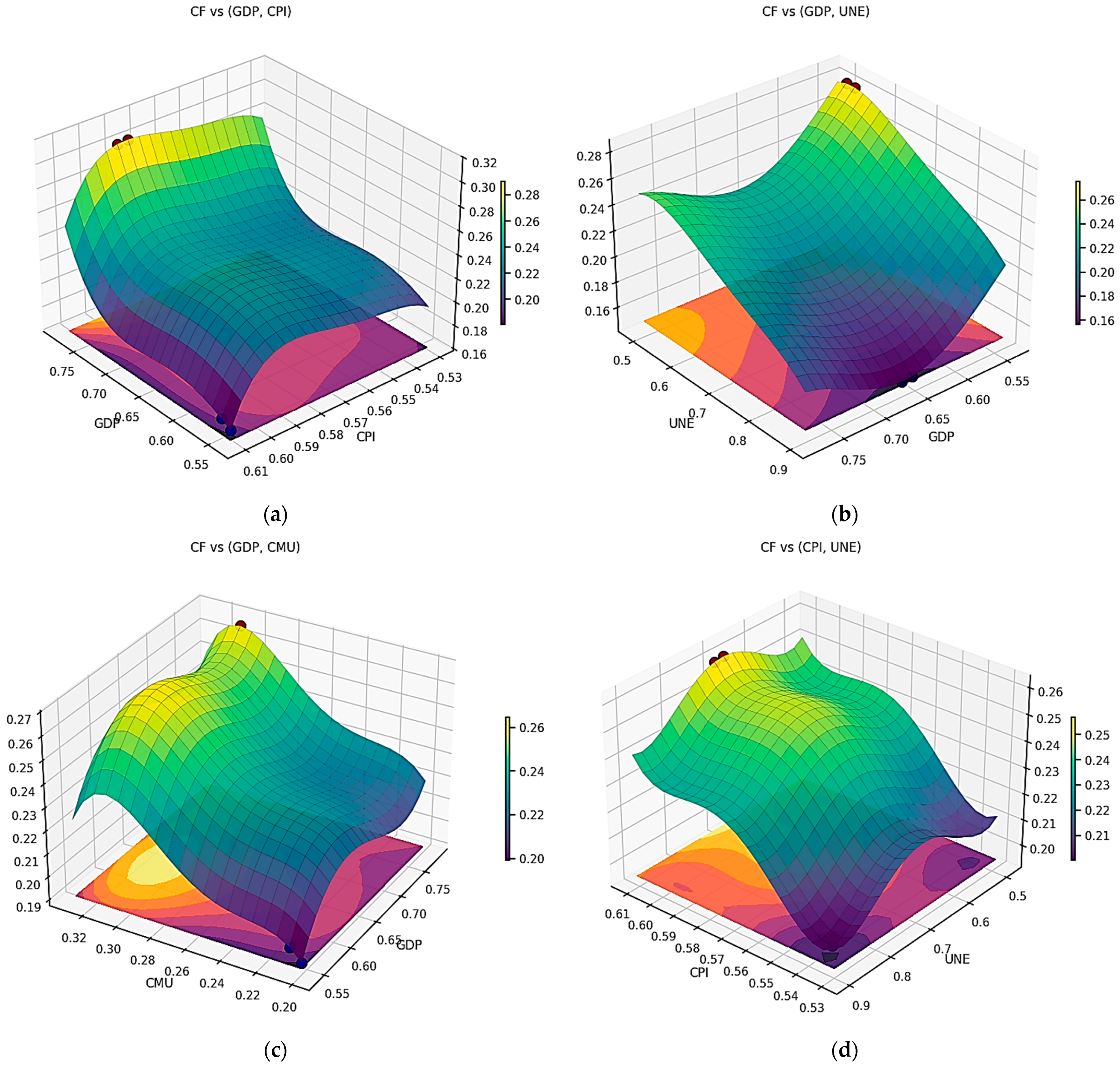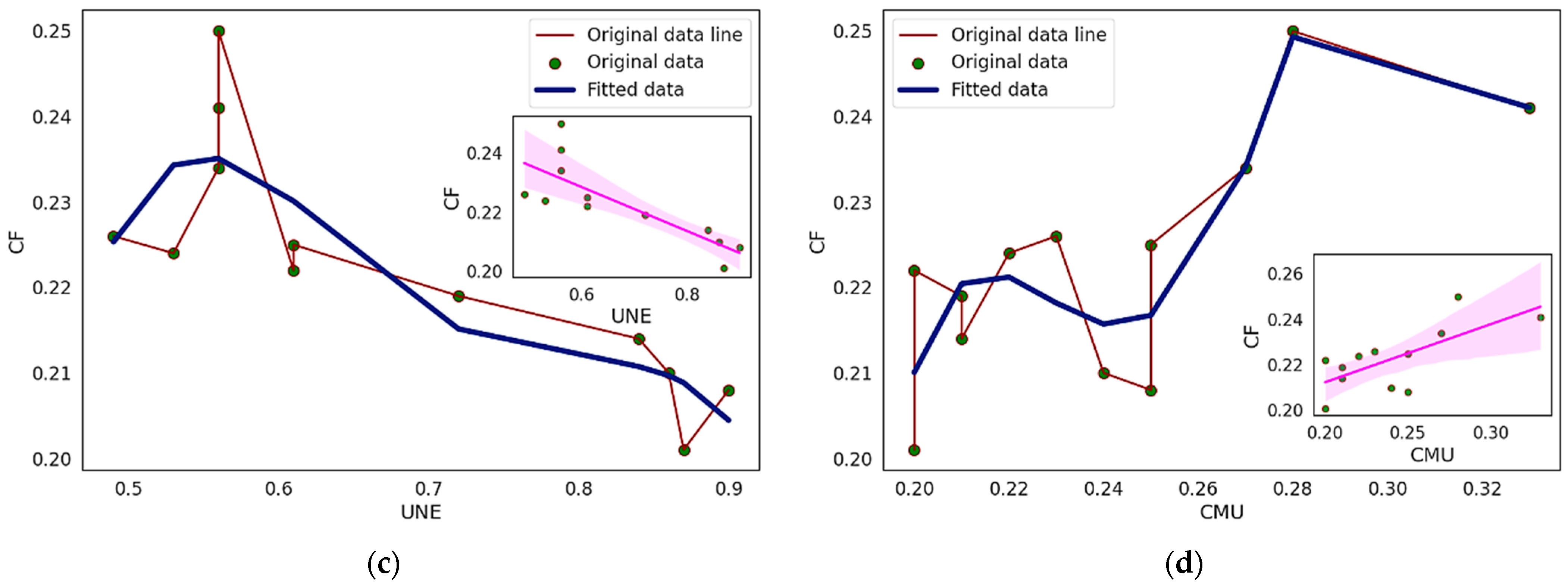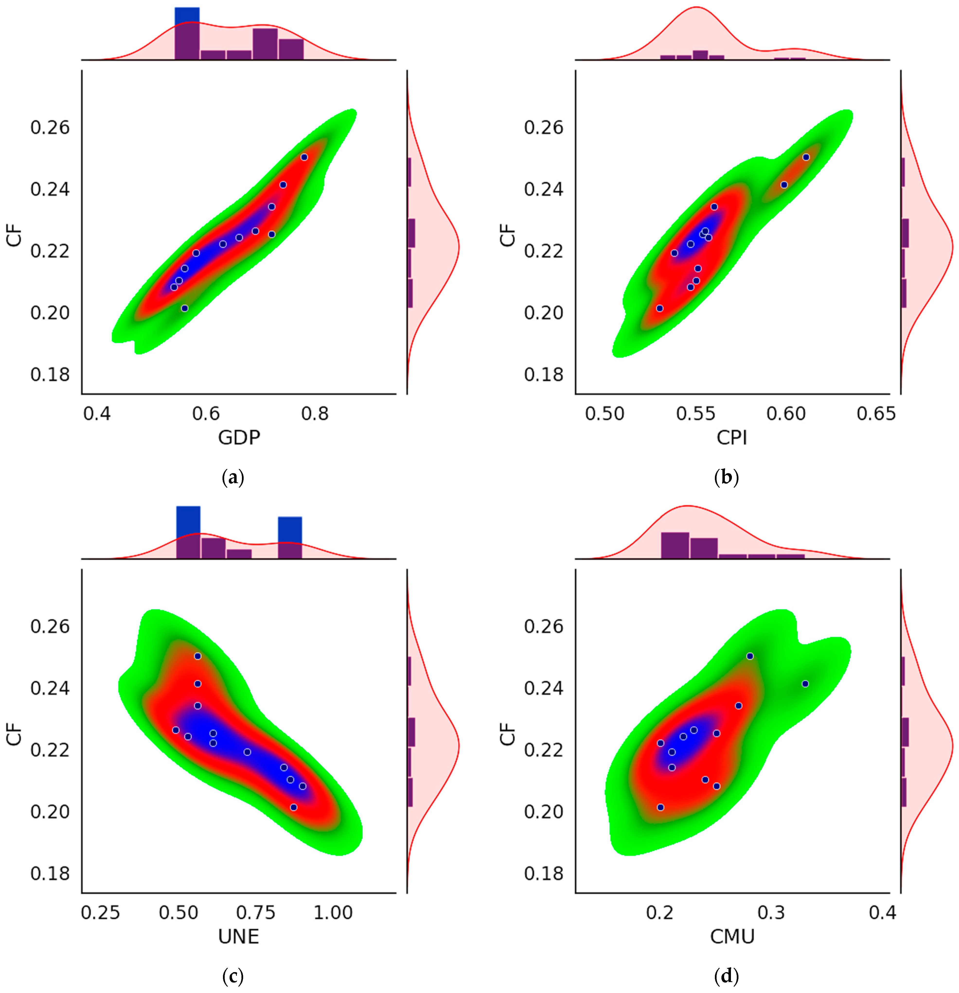 Figure 1. Only those variables with a correlation coefficient greater than 0.7 with CF were retained for detailed analysis, ensuring a statistically significant and meaningful relationship with the target variable. Based on this criterion, four variables were selected: Gross Domestic Product (GDP), Price Level Indices (CPI), Unemployment Rate (UNE), and Circular Material Use Rate (CMU).