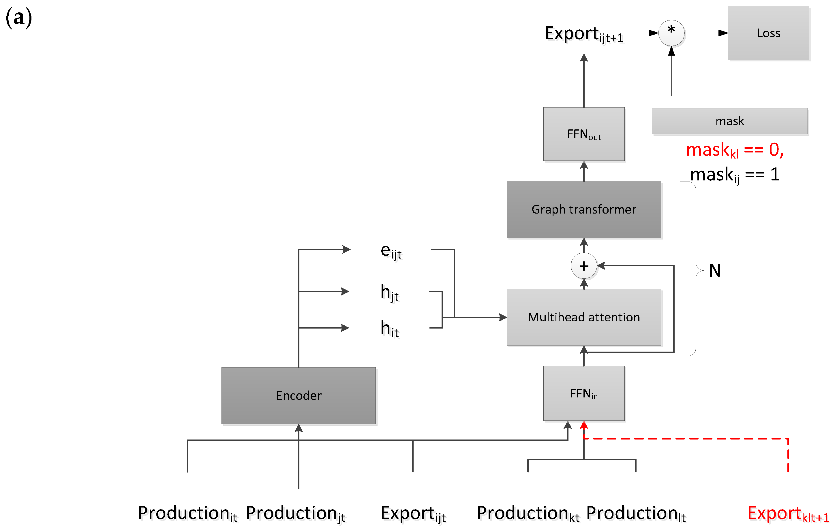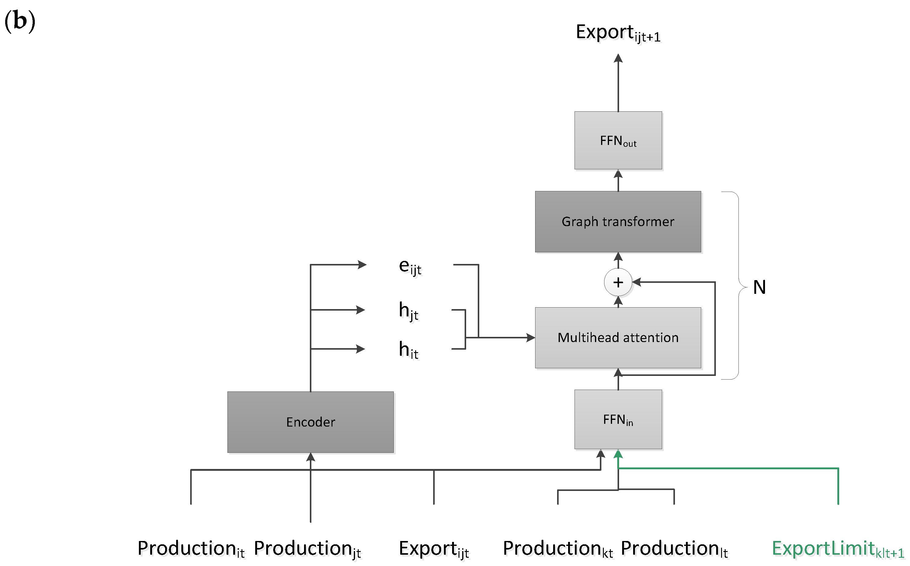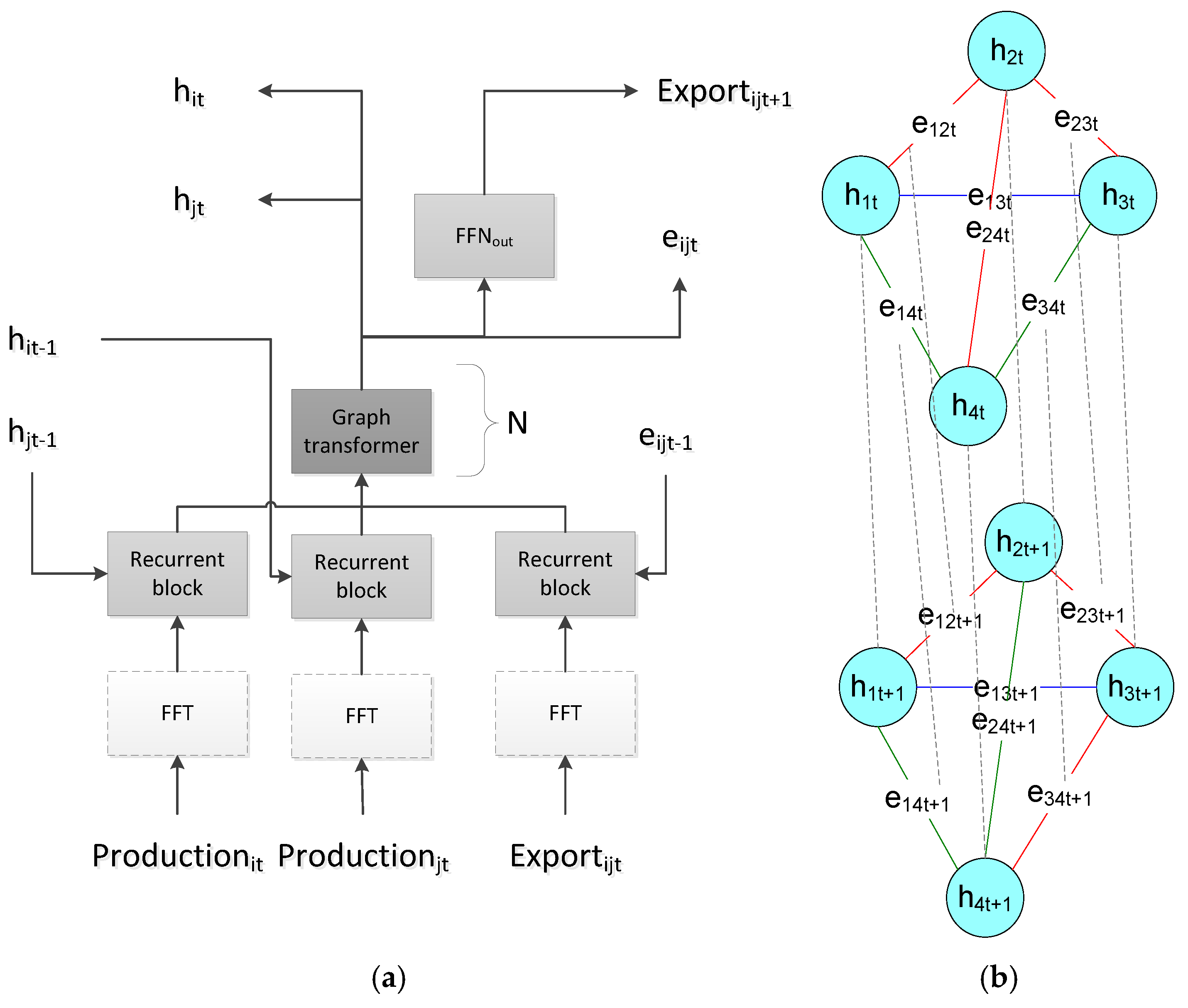 - We propose a hybrid model that combines a graph transformer and recurrent network architectures to tackle the problems above. This model utilizes the transformer to catch the interdependence between wheat export quantities in different countries. As a recurrent network, the proposed model also generates hidden embeddings for each country and export direction and utilizes these embeddings from the previous step to forecast exports. This way, the model summarizes the trading history via the hidden embeddings and uses them to perform accurate export predictions.