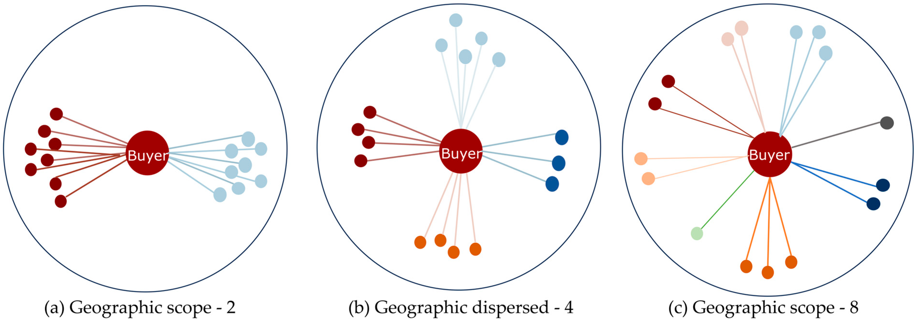 Existing research has extensively examined the motivations for supplier diversification, but has given less attention to the organizational capabilities needed to implement a geographically dispersed strategy. As shown in Figure 1, where the central node represents the focal firm and surrounding nodes represent suppliers (with colors indicating geographic regions), the progression from panel (a) to (c) illustrates a trend toward greater geographic dispersion.