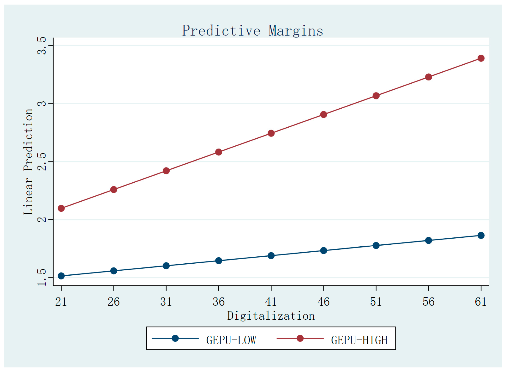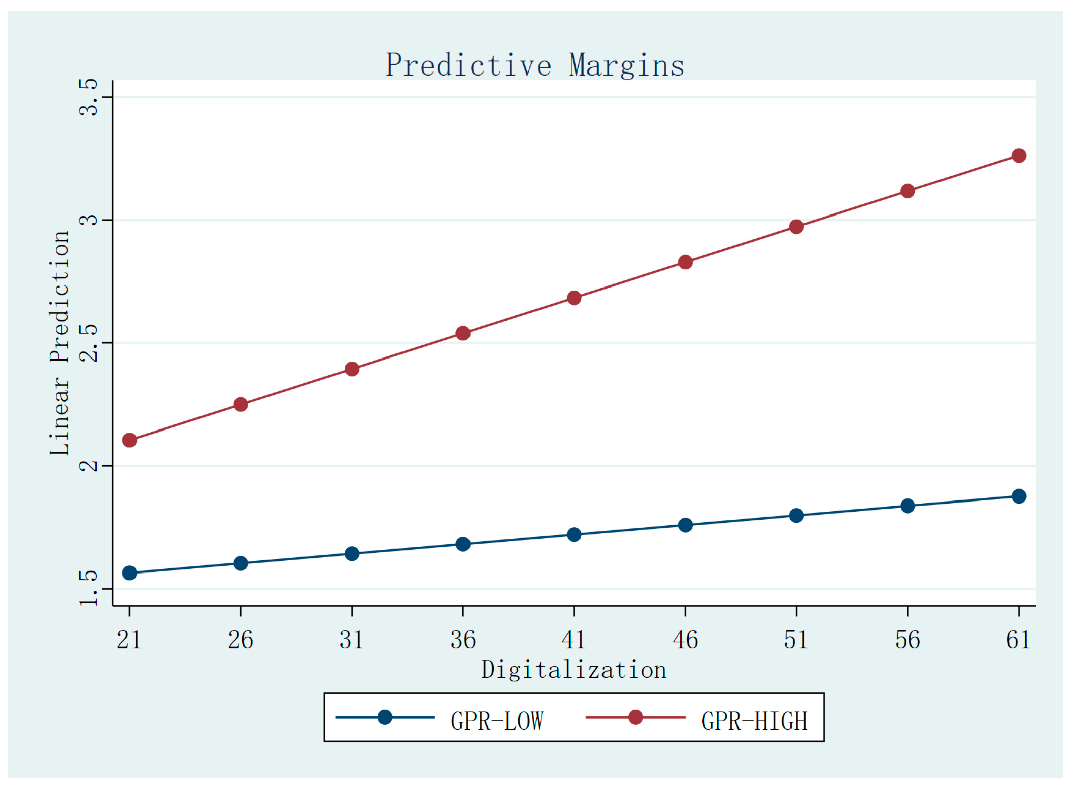 However, digitalization may not be effective under all levels of geopolitical risk. In extreme cases, such as economic sanctions [60] or war, digital capabilities can be overridden. Governments may force companies to decouple their supply chains. In these situations, firms must restructure regardless of their digital strength. This means that at very high levels of GPR, the effect of digitalization may be attenuated as its role is superseded by political mandates. We therefore suggest a more precise view: GPR strengthens the link between digitalization and geographic dispersion only up to a point. Beyond that point, the effect may fade. Thus, we hypothesize: