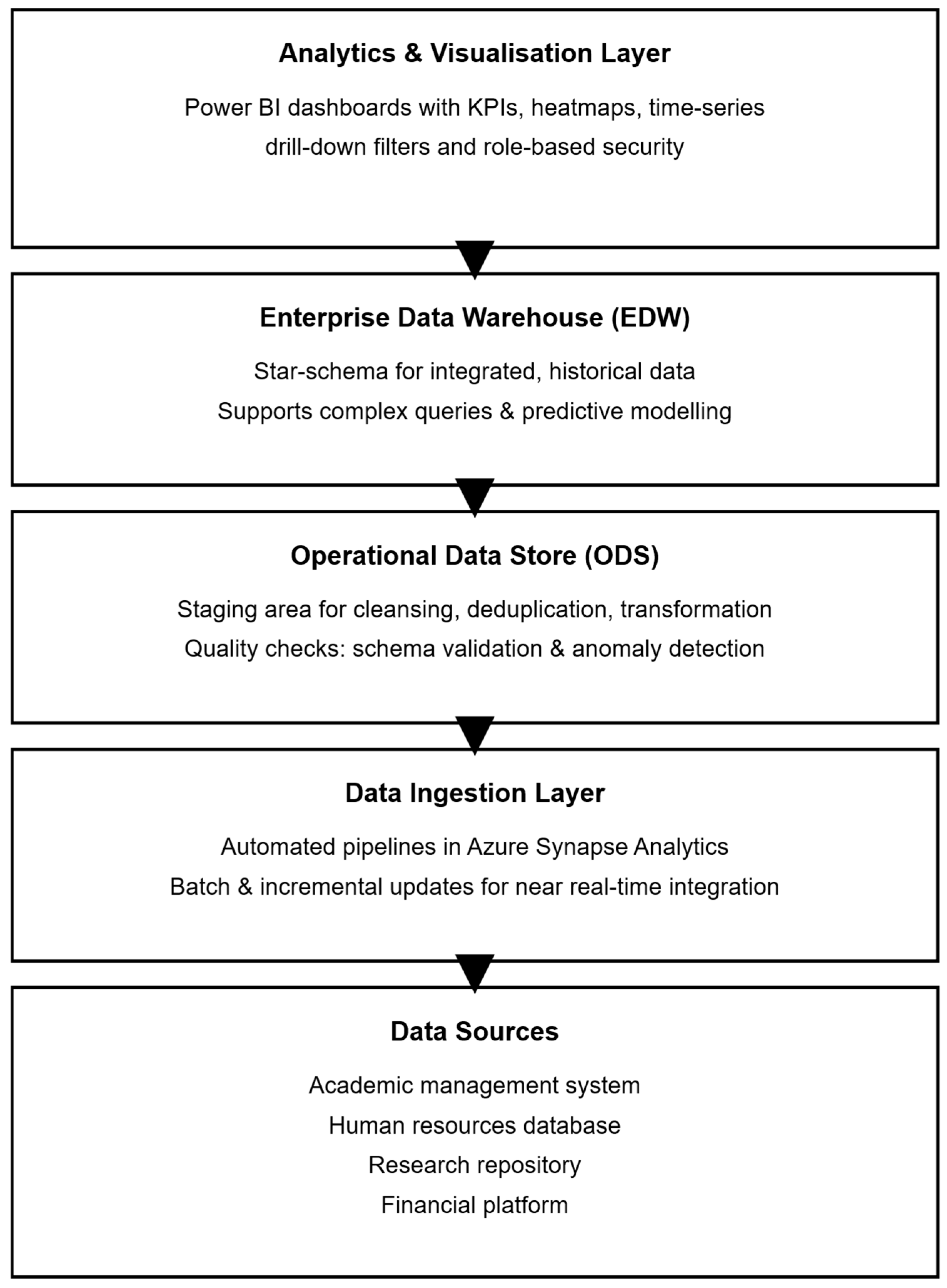 - Analytics and Visualisation Layer: interactive dashboards built with Microsoft Power BI, presenting KPIs and trends tailored to strategic, tactical and operational decision levels. Features include drill-down capability, automated alerts and natural-language query functions to support proactive management [23,27].